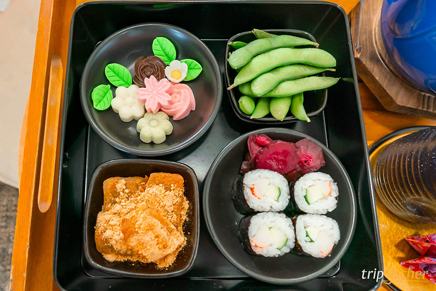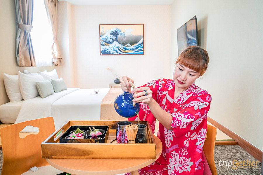 ใครที่ซื้อ Yukata Package ก็สามารถสั่งเซ็ต Afternoon Tea มากินบนห้องได้เลย ในเซ็ตประกอบด้วยชาเขียวร้อนและขนมญี่ปุ่น อย่างดังโงะ ถั่วลันเตาญี่ปุ่น วาราบิโมจิ ขนมถั่วแดงกวน