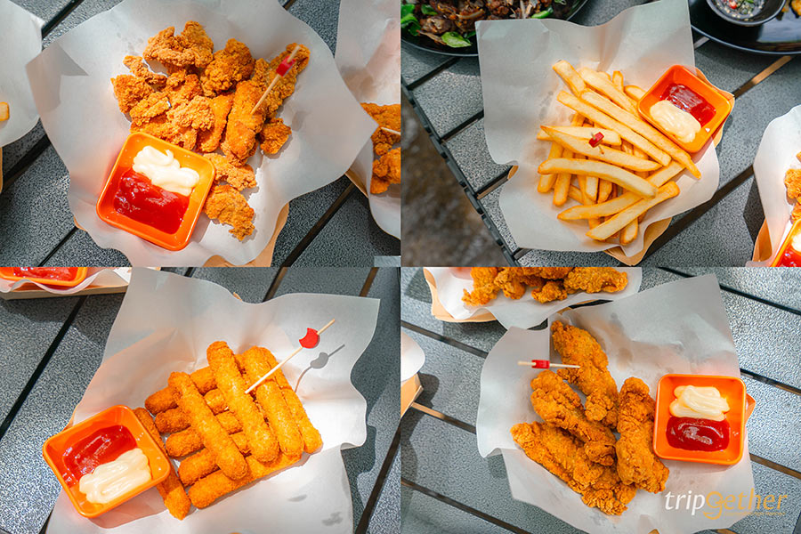 ส่วนเมนูกินเล่นก็จะเป็นพวกของทอดกรอบ เราก็จัดเต็มไปเลย 4 เมนู ไม่ว่าจะเป็นเฟรนช์ฟรายส์ นักเก็ตสติ๊ก ชิกเก้นริบ ไก่ป๊อป ทุกจานราคา 70 บาท กินตอนร้อนๆ กรอบกำลังดี ใครสายของทอดห้ามพลาดเด็ดขาด