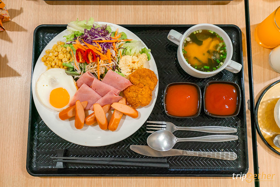 ส่วน เซ็ตอาหารอเมริกัน จะเสิร์ฟมาในจานเดียว มีทั้งไข่ดาว ไส้กรอก แฮม นักเก็ต และสลัดผัด รวมถึงมีซุปมิโซะให้ซดร้อนๆ