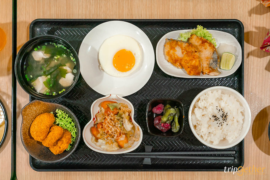 เซ็ตอาหารญี่ปุ่น น่ากินมาก เสิร์ฟมาแบบจัดเต็มทั้งข้าว ปลาซาบะ ซุปมิโซะ นักเก็ต ไข่ดาว สำหรับเราเซ็ตนี้อิ่มแบบจุกๆ