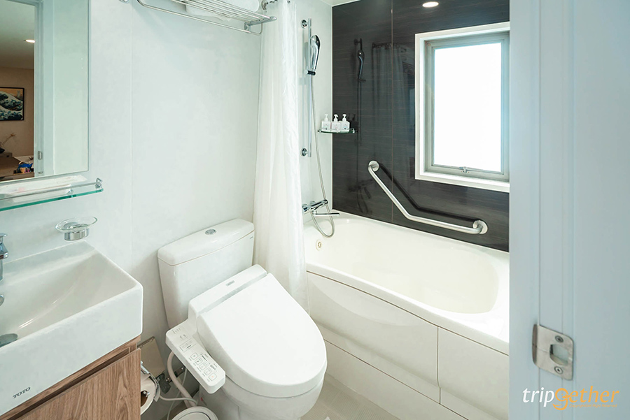 ส่วนของห้องน้ำจัดสรรพื้นที่อย่างดี ไม่แคบ มีอ่างอาบน้ำ เรนชาวเวอร์ และโถชักโครกเป็นระบบอัตโนมัติ พร้อมอุปกรณ์อาบน้ำ ไม่ว่าจะเป็นแปรงสีฟัน ยาสีฟัน สบู่ แชมพู ครีมนวด ผ้าเช็ดตัว