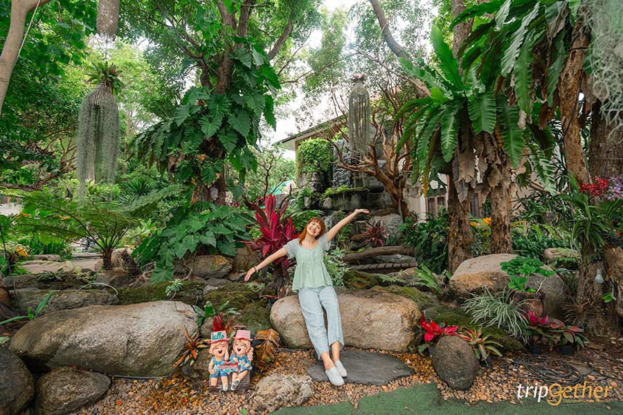 บรรยากาศรอบๆ ร้านกรีนมาก และข้างๆ ตัวร้านมีสวนให้ได้เดินเล่นด้วย รวมถึงมีน้ำตกจำลองและสัตว์ตัวน้อยๆ เต็มไปหมด