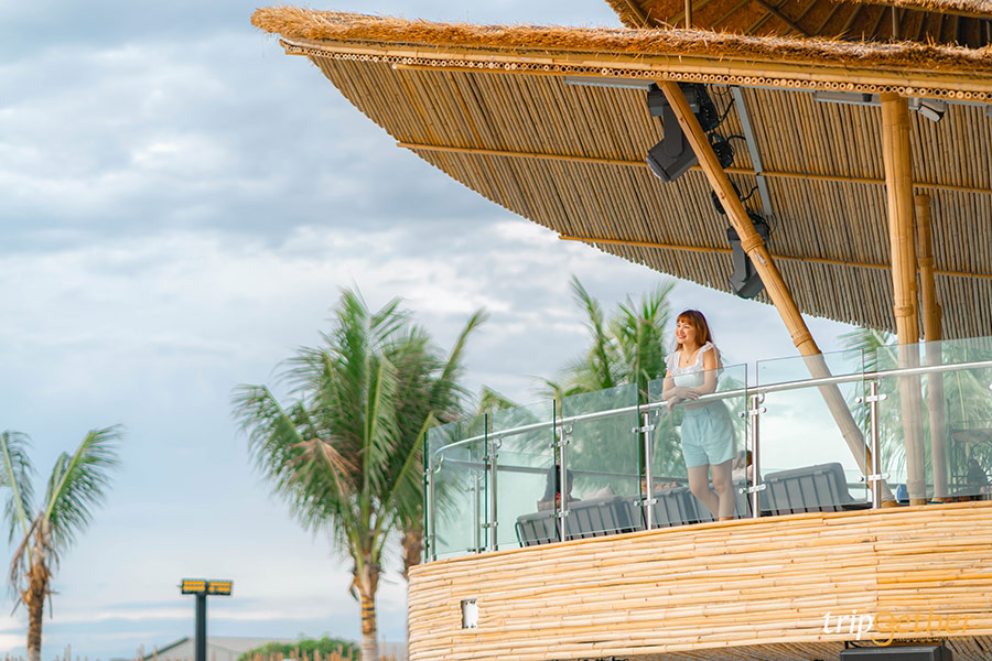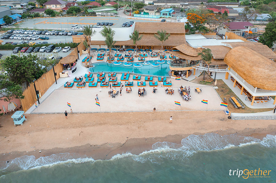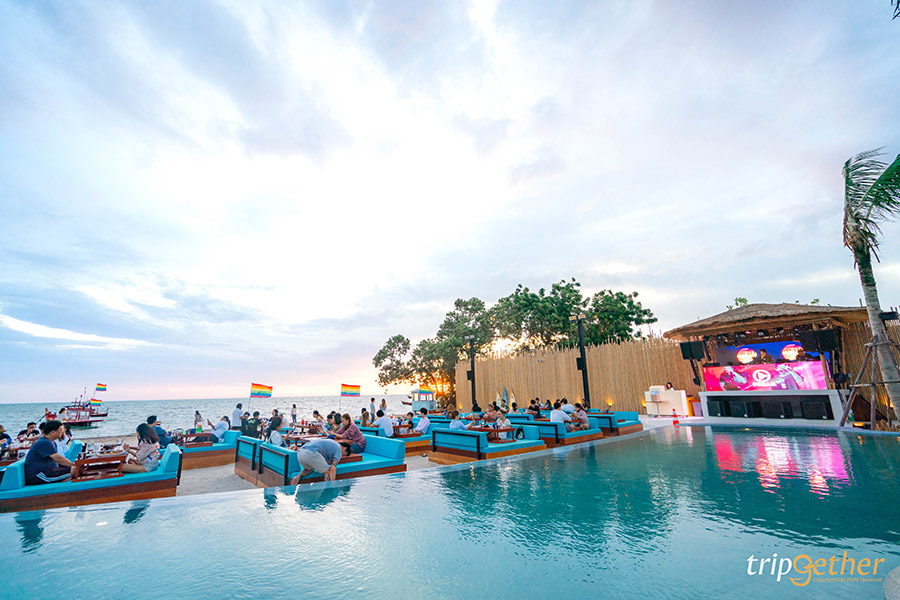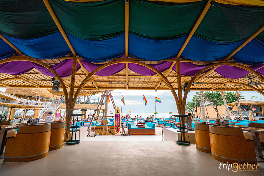 โซนนั่งเป็นแบบโอเพ่นแอร์ มีให้เลือกเยอะมาก แต่ละโซนก็ให้ฟีลที่ต่างกันไป สำหรับโซนฮิตก็คือโซนแซนหรือบนหาดทราย มุมนี้เป็นโต๊ะนั่งริมทะเล เห็นพระอาทิตย์ตกดิน ความชิลล์เต็มร้อย ส่วนใครสายคอนเทนต์ อยากได้นั่งชิลล์พร้อมได้รูปสวยก็ต้องมาโซน pool เป็นที่นั่งกลมกลางสระว่ายน้ำ บรรยากาศเย็นสบาย และถ้าอยากจอยๆ โดดลงสระก็สามารถทำได้เลย แต่ต้องเปลี่ยนเป็นชุดว่ายน้ำก่อนนะ