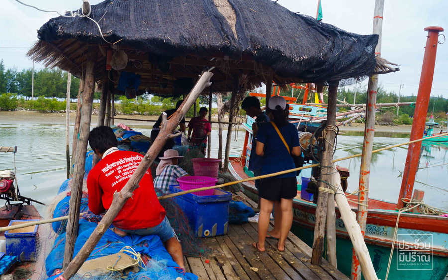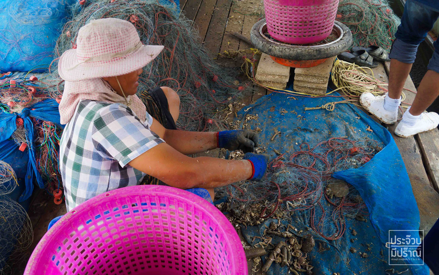 โชคดีจริงๆที่ผู้ใหญ่บ้านกำลังปลดอวนอยู่ ทำให้เราได้เรียนรู้วิถีชีวิตของชาวประมงไปในตัวเลยว่าเป็นอย่างไร