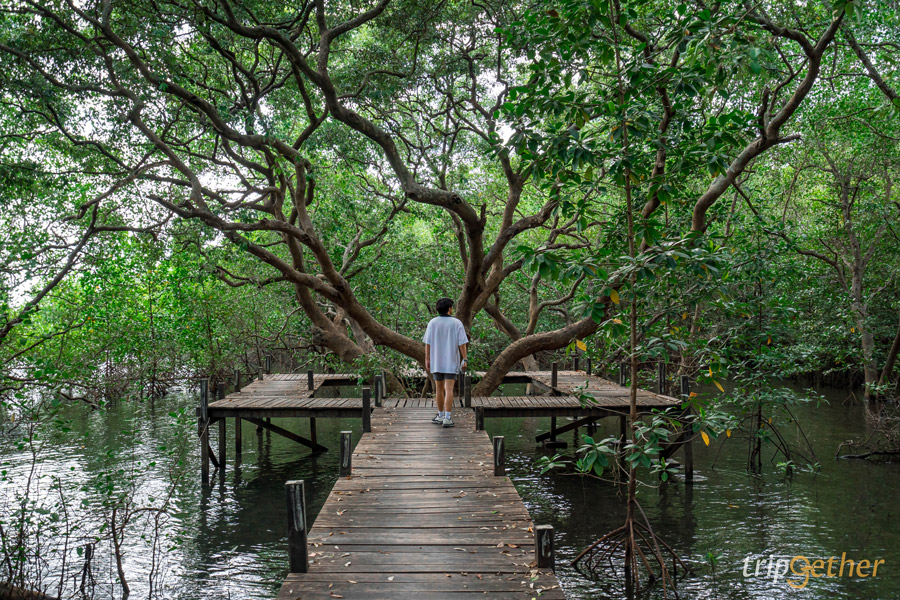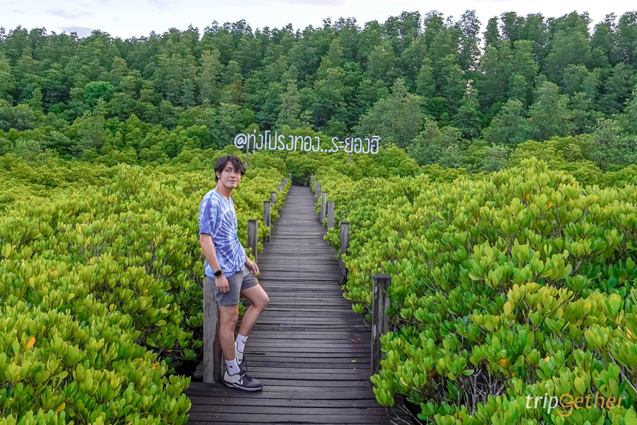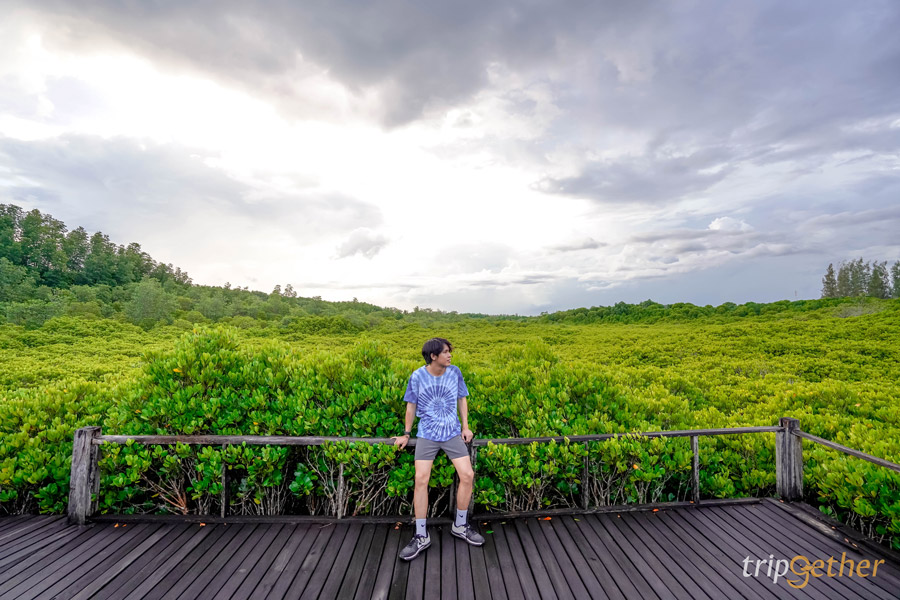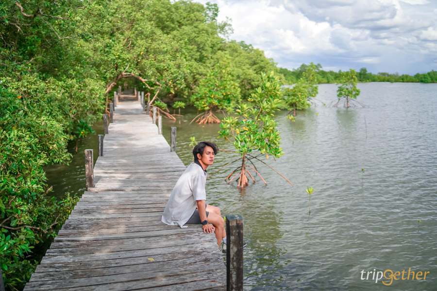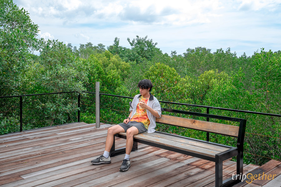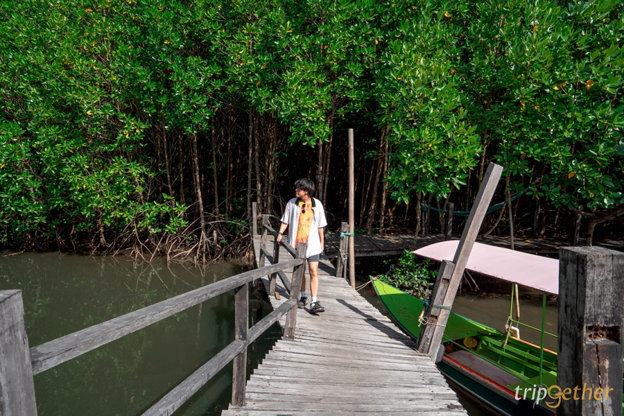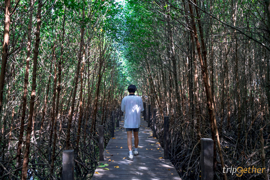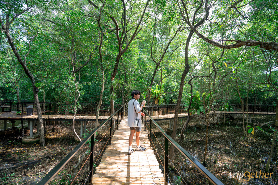แต่เช้านี้แรงยังเหลือ เราเลยเลือกวิธีเดินเท้าชมบรรยากาศกันแบบเรื่อยๆ เหนื่อยก็พัก มีสะพานเดินศึกษาธรรมชาติ ชมพันธุ์ไม้นานาชนิด อาทิ ต้นลำพู ต้นแสม ต้นโกงกาง ต้นตะบูนดำ โปรงแดง โปรงทอง