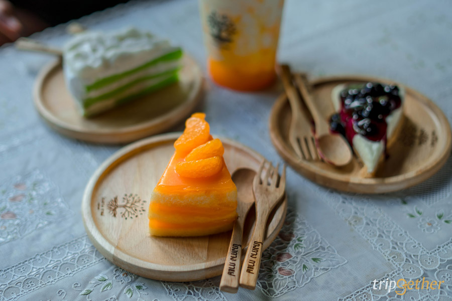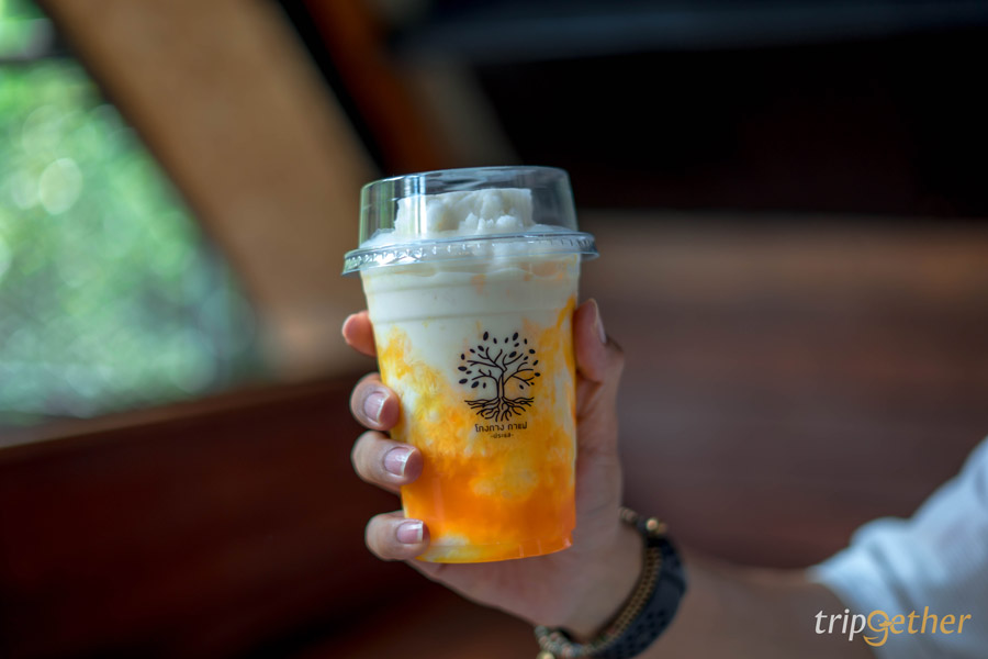 เมนูซิกเนเจอร์ของร้าน โกงกางเฟรปเป้ 80 บาท เค้กส้มหน้านิ่ม 95 บาท ชีสเค้กบลูเบอรี่ และเค้กมะพร้าวใบเตย 95 บาท