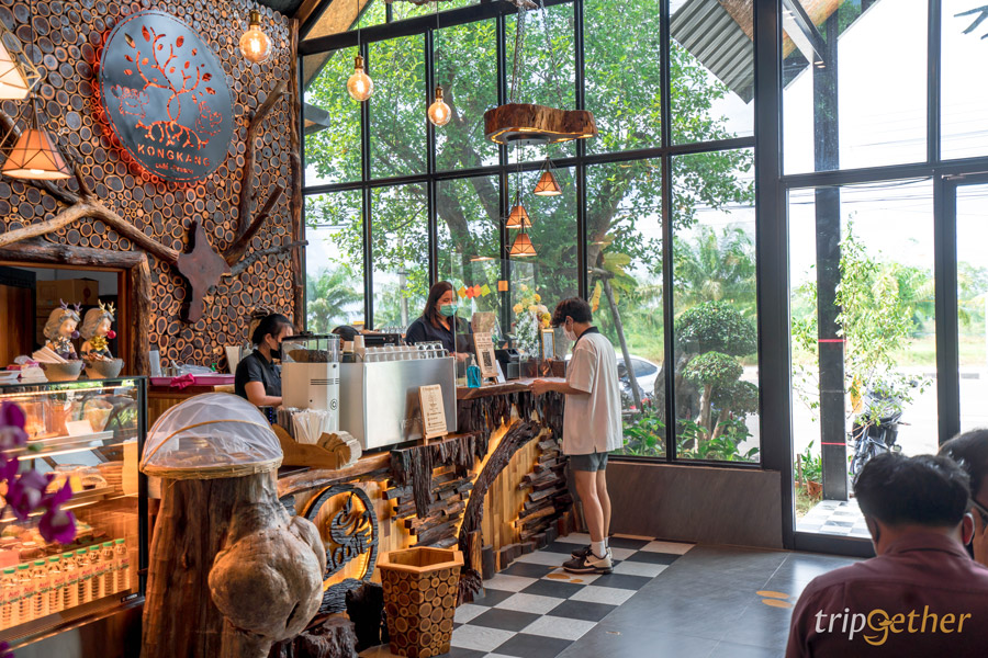 ใช้เวลาเดินเที่ยวเก็บเกี่ยวความสุขกับธรรมชาติกันอยู่พักใหญ่ ก็เริ่มหิวอีกแล้ว เลยมาแวะกันที่โกงกางกาแฟ ร้านคาเฟ่บรรยากาศดีที่ดีไซน์ตัวร้านในสไตล์ลอฟท์เท่ๆ ไฮไลท์ของที่ร้านจะมีโซนห้องใต้หลังคาให้หลบมุม นั่งตากแอร์ กินขนม และเมื่อมองจากไปจะเห็นวิวป่าโกงกางที่ล้อมตัวร้านไว้