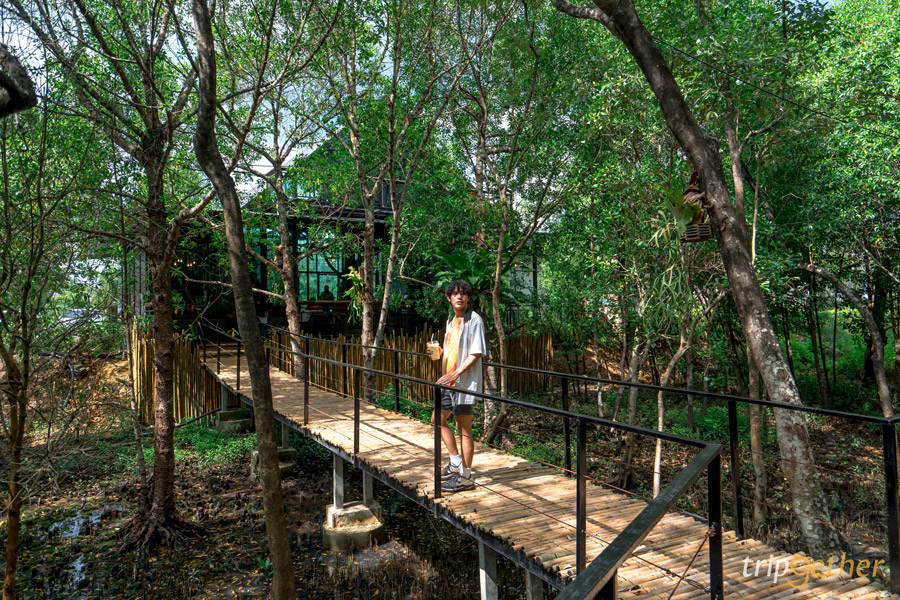 กินกาแฟ กินขนมจนชื่นใจก็มาเดินเล่นที่มุมด้านหลังร้านกันต่อ ซึ่งโซนนี้จะมีสะพานที่ทอดยาวเข้าไปในพื้นที่ของป่าโกงกาง มีเรือนไม้ 2 ชั้นให้เราได้ขึ้นไปชมวิวสวยๆ ด้วย