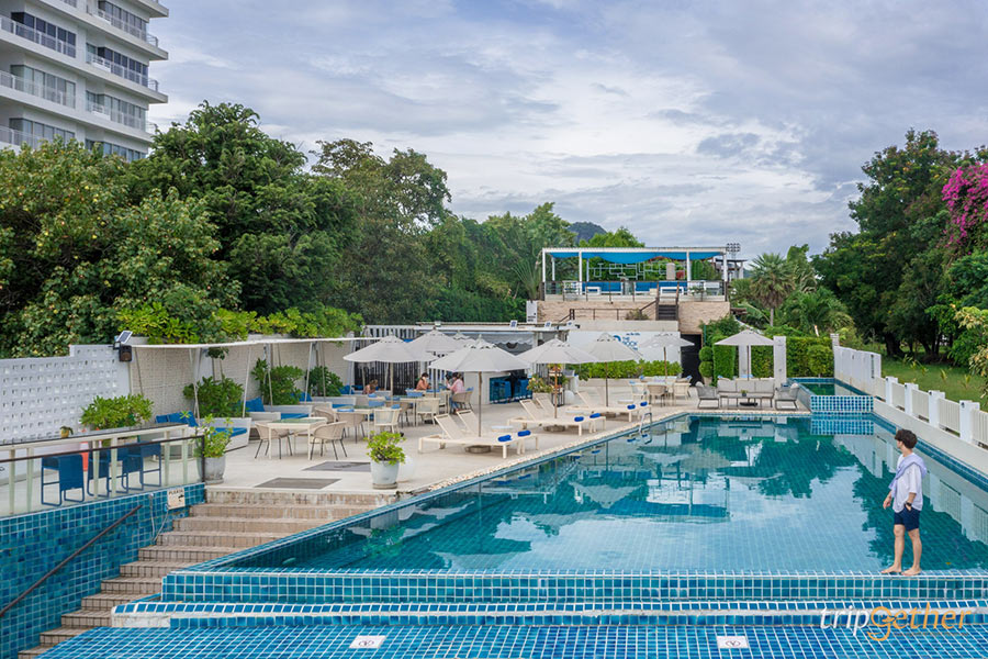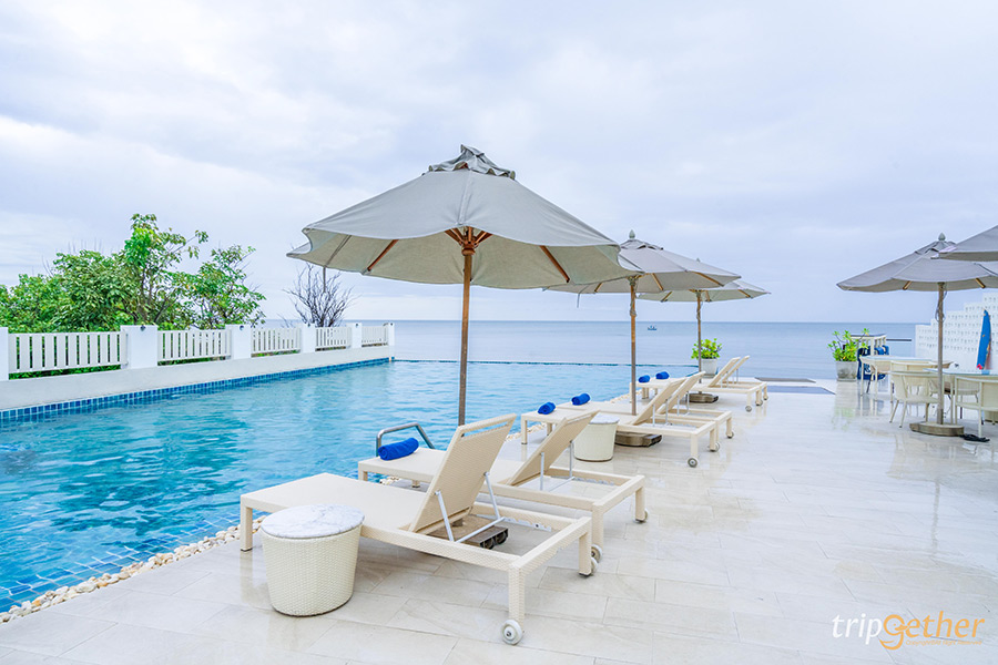 ความโดดเด่นของที่นี่ก็คือมุมพื้นที่สระว่ายน้ำที่เป็นแบบ Infinite – edge pool ที่ขอบไม่สูงและสามารมองเห็นเป็นพื้นเดียวกับท้องทะเลได้แบบเต็มๆ อีกทั้งยังมีเก้าอี้หลากหลายรูปแบบให้เลือก ไม่ว่าจะเป็นเก้าอี้อาบแดด โซฟาชายหาด รวมทั้งบาร์นั่งห้อยขาที่มองเห็นวิวชายได้ได้แบบ HD อีกด้วย