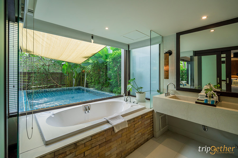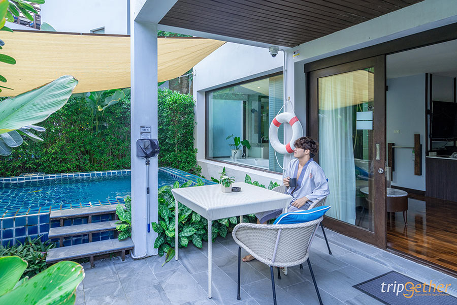 ในส่วนของอ่างจากุชชี่นอกจากจะได้แช่น้ำสบายๆ แล้ว ยังห้อมล้อมไปด้วยความเขียวขจีของต้นไม้แนวโมเดิร์นทรอปิคอลอีกด้วย และยังมีชุดโต๊ะเก้าอี้ด้านนอก ให้ได้จิบกาแฟ ดื่มน้ำ ในบรรยากาศสวนหลังบ้าน