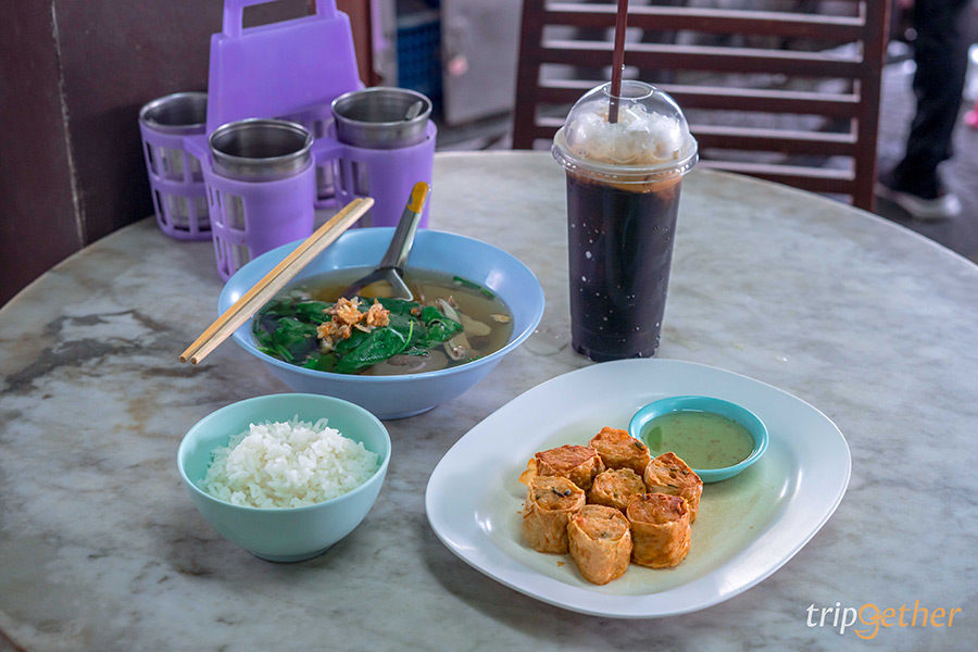 เมนูอาหารมีให้เลือกอย่างหลากหลาย ทั้งเมนูโจ๊ก ข้าวต้ม ข้าวมันไก่ ต้มเลือดหมู ฯลฯ แถมยังมีเมนูเครื่องดื่มให้เลือกอีกด้วย เรียกได้ว่าเป็นร้านรวมอาหารเช้าเลย ซึ่งเมนูที่เราเลือกชิมก็จะเป็นต้มเลือดหมูคู่กับข้าวเปล่าร้อนๆ 60 บาท เมนูอร่อยอย่างหอยจ๊อกุ้ง 100 บาท และเมนูเครื่องดื่มโบราณอย่างโอเลี้ยงยกล้อ ราคา 30 บาท บอกเลยว่าอร่อยสมคำร่ำลือจริงๆ ทุกคน