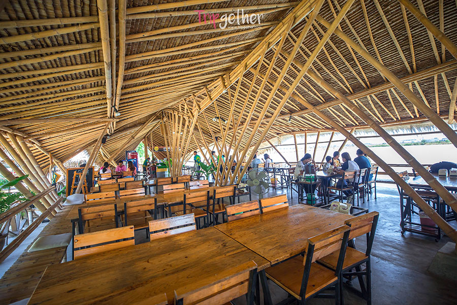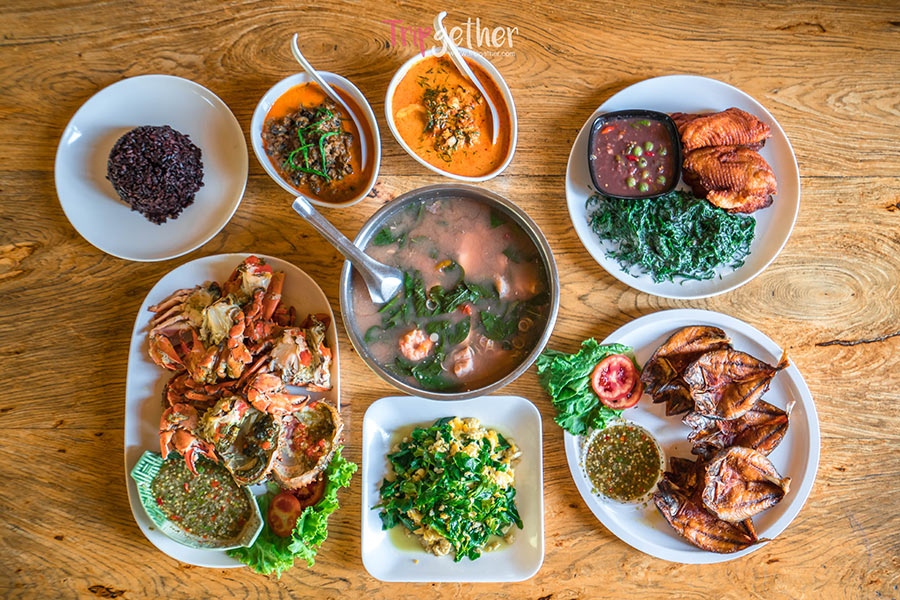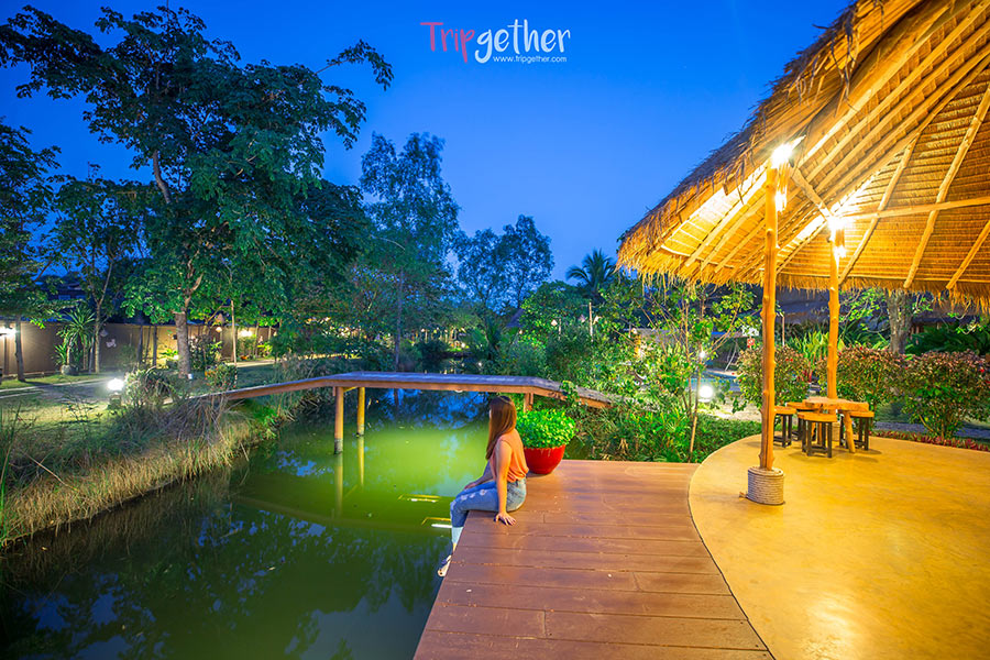 ช่วงเย็นทางรีสอร์ทก็มีบริการห้องอาหารริมน้ำ บรรยากาศชิลล์ๆ โดยมีเมนูแนะนำเป็น ห่อหมก, ชุดน้ำพริกกะปิ, ยำส้มโอกุ้งแม่น้ำ และข้าวผัดปลาทู