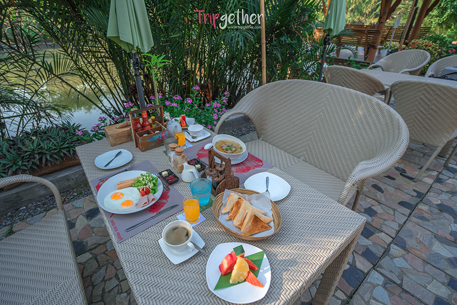 หลังจากทำบัญตักบาตรเรียบร้อย ก็ถึงเวลาอาหารเช้าพอดี ทางรีสอร์ทก็มีอาหารเช้าแบบเช็ตให้เราได้เลือกรับประทาน ซึ่งเมนูอาหารจะรวมอยู่ในราคาห้องพักเรียบร้อยแล้วจ้า