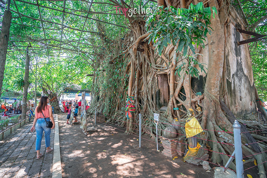 กินของอร่อยเติมพลังกันเรียบร้อย ก็ออกเดินทางกันต่อไปยังวัดบางกุ้ง วัดเก่าแก่คู่บ้านคู่เมืองชาวอัมพวา ที่มีประวัติมายาวนาน ไฮไลท์ของวัดนี้คืออุโบสถหลังเดิมที่สร้างตั้งแต่สมัยกรุงศรีอยุธยาเป็นราชธานี จะถูกปกคลุมด้วยรากไม้ใหญ่ทั้งโพ ไทร ไกร และกร่างมอง ส่วนภายในมีพระพุทธรูปประดิษฐานชาวบ้านเรียกว่า “หลวงพ่อโบสถ์น้อย” (หลวงพ่อนิลมณี)