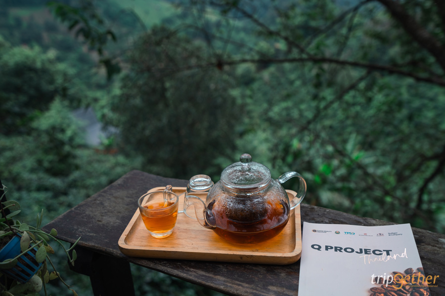 นอกจากนี้ทางไร่กาแฟครอบครัวมะยังมีบริการพิเศษสำหรับผู้เข้าพักอีกด้วย นั่นก็คือ เครื่องดื่มร้อนที่เสิร์ฟให้ถึงห้อง มีทั้ง ชาดอกกาแฟ ชาอัสสัม ชาคาโมมาย หรือจะเป็นกาแฟดริปร้อน และอเมริกาโนร้อน ซึ่งสามารถเลือกได้ตามความชอบเลย โดยเราเลือกเป็นชุดชาดอกกาแฟ ที่มีความหอมอ่อนๆ มีรสชาติเฉพาะตัว และที่สำคัญส่วนของดอกจะไม่มีคาเฟอีนผสมอยู่เหมือนในเมล็ด
