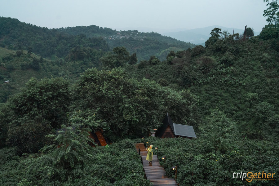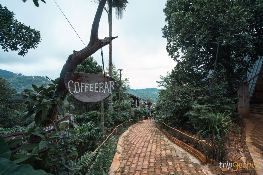 ตามทางเดินไปยังที่พักจะมีต้นกาแฟที่มีผลอยู่เต็มต้นขึ้นอยู่ตลอดทาง สลับกับต้นไม้หลากหลายชนิด เดินไปเพลินๆ ก็ยิ่งสดชื่น เพราะมองไปทางไหนก็เขียวแบบสุดๆ