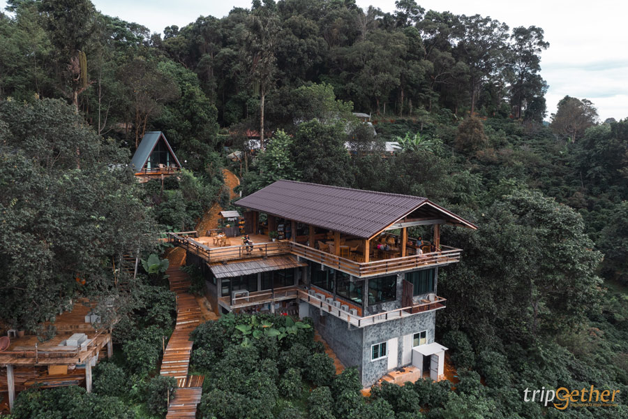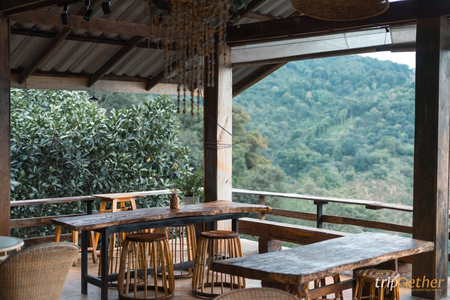 ที่นั่งในร้านก็จะเป็นโถงกว้างแบบโอเพ่น มองเห็นวิวไร่กาแฟและหมู่บ้านปางขอนได้แบบเต็มๆ