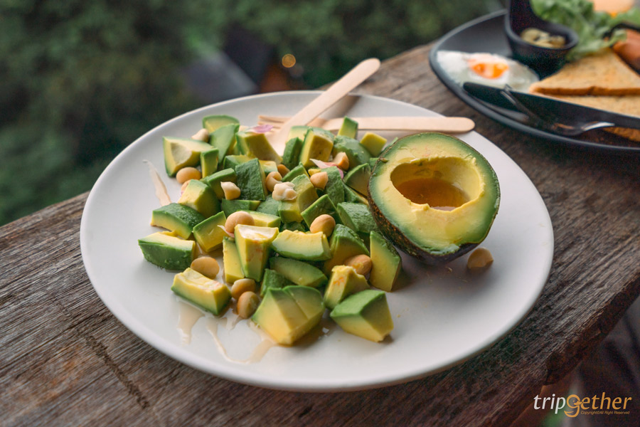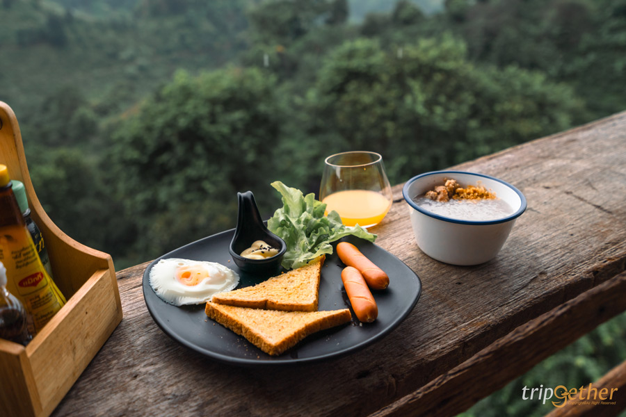 ออกมานั่งดูหมอก รับไอเย็นได้สักช่วงจนถึงช่วง 7.30 น. อาหารเช้าก็เสร็จพอดี ซึ่งเช็ตอาหารเช้าของไร่กาแฟครอบครัวมะจะเป็นทั้งชุด American Breakfast ที่มีทั้งขนมปังปิ้ง ไส้กรอก ไข่ดาว และผักสลัด พร้อมกับโจ๊กหมูสับ น้ำส้ม เท่านั้นยังไม่พอเพราะยังมีอะโวคาโดและแมคคาเดเมียที่เป็นผลผลิตออแกนิคจากทางไร่เอง ราดด้วยน้ำผึ้งป่าที่มีกลิ่นและความหวานที่เป็นเอกลักษณ์