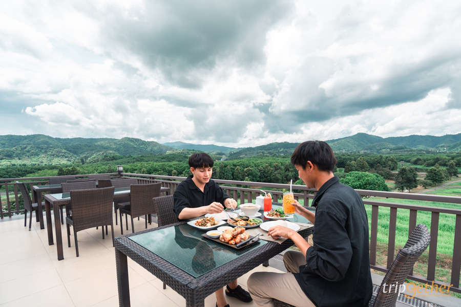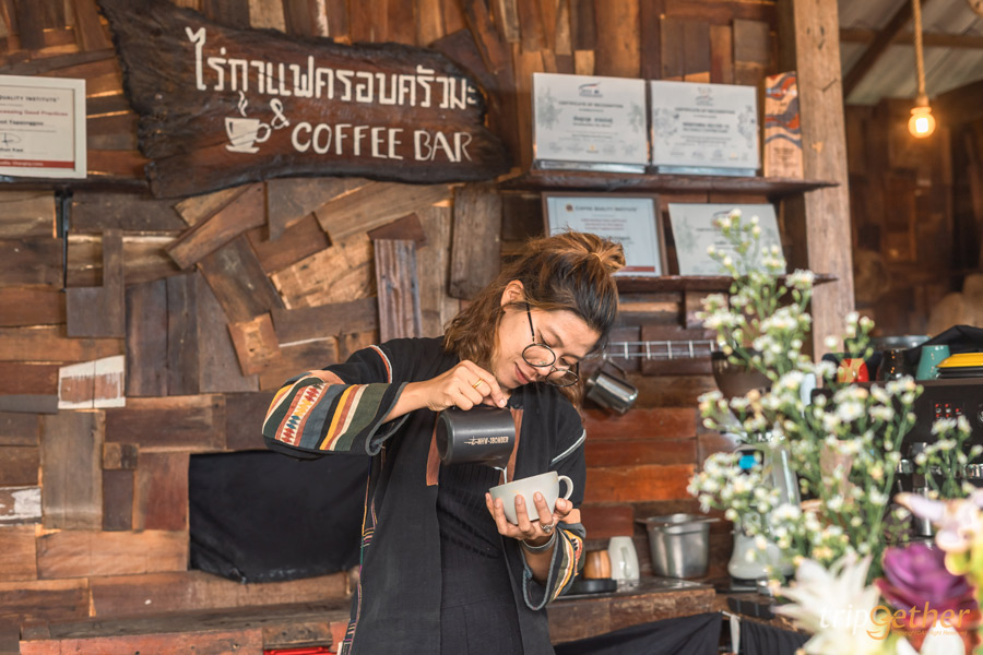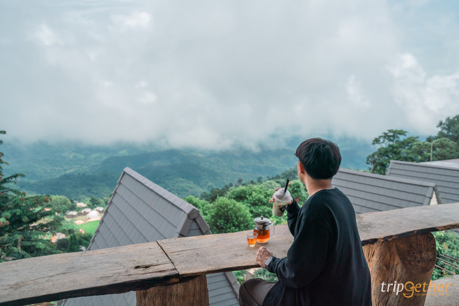 เก็บกระเป๋า นั่งพักเรียบร้อยแล้ว เราก็เดินขึ้นมาที่ส่วนของ Coffe Bar โดยส่วนนี้จะเป็นทั้งร้านกาแฟและห้องอาหาร ซึ่งร้านกาแฟของที่นี่มีทั้งเมนูกาแฟที่ใช้เมล็ดของทางไร่เอง และเมนูชาหลากหลายกลิ่นหลายรสชาติ และที่นั่งก็มีให้เลือกทั้งกด้านในโถง เอาท์ดอร์ที่เป็นลานด้านนอก และมุมใต้ต้นนางพญาเสือโคร่งสุดร่มรื่น แต่ไม่ว่าจะนั่งมุมไหนก็เห็นวิวภูเขาและหมู่บ้านที่อยู่บนดอยอีกลูกได้แบบพาโนราม่าฉ่ำๆ