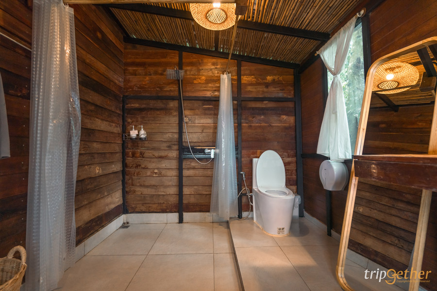 ห้องน้ำก็ดีงามไม่แพ้กัน เพราะมีทั้งอ่างอาบน้ำพร้อมกับกระจกบานใหญ่ที่ปิดเปิดได้ กระจกตั้งบานใหญ่ โต๊ะเครื่องแป้ง ฝักบัวแบบ Rain Shower รวมทั้งชุดคลุมอาบน้ำและไดร์เป่าผม