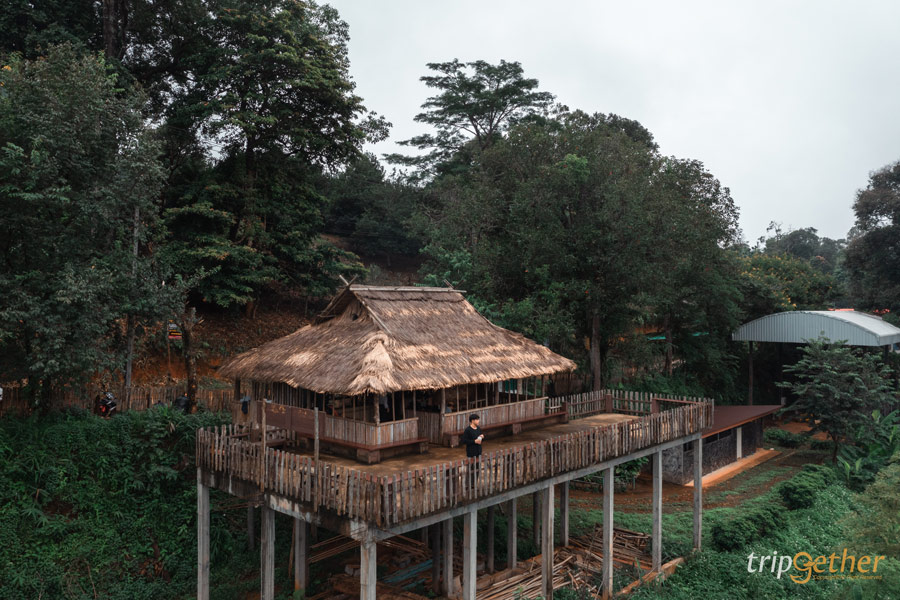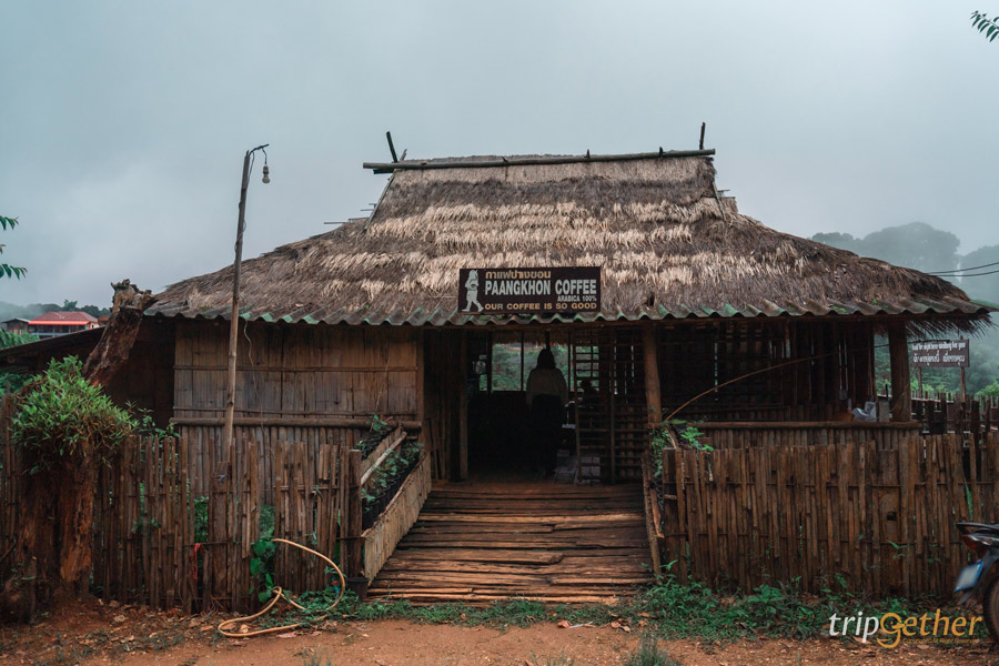 เช็คเอาท์ออกจากไร่กาแฟเรียบร้อย เวลาประมาณ 10 โมงนิดๆ แต่ยิ่งสายหมอกยิ่งลงจัดมาก เราเลยแวะที่ร้านกาแฟในหมู่บ้านกันก่อนที่ร้านกาแฟปางขอน ที่ตั้งอยู่ริมทางเข้าหมู่บ้านเลย ตัวร้านเป็นอาคารไม้ไผ่เล็กๆ ตั้งอยู่บนเนินเขา ทุกส่วนของร้านยังใช้วัสดุจากธรรมชาติแทบทั้งหมดเลยด้วย ให้กลิ่นอายบ้านเรือนของชาวเขาแบบสุดๆ