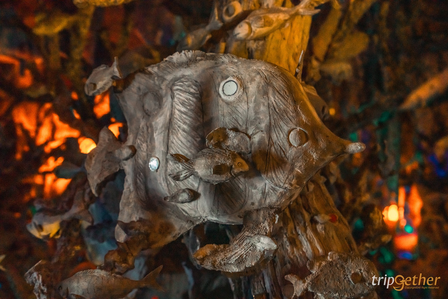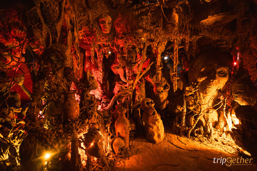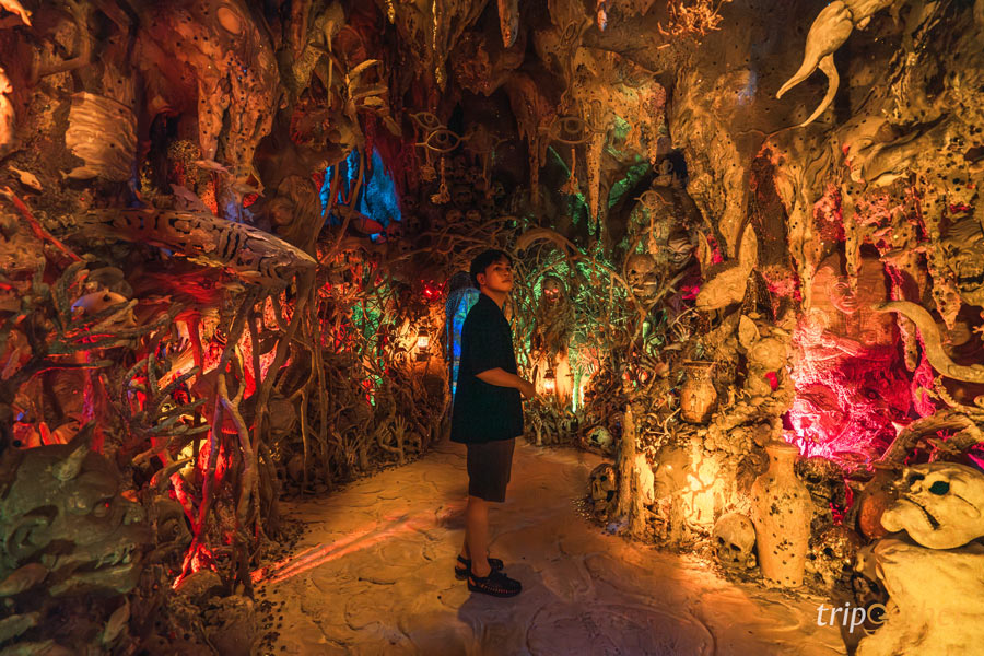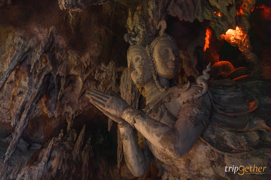 เมื่อเข้าสู่ภายในถ้ำ สิ่งแรกที่สัมผัสได้เลยก็คือ ความสงบ เงียบ และความสวยงามของงานศิลปะปูนปั้น ซึ่งทางเดินภายในถ้ำจะเป็นทางยาวมีโถงเล็กและใหญ่สลับกัน ในส่วนแรกเป็นการจำลองโลกบาดาลที่มีสัตว์น้ำน้อยใหญ่ ไม่ว่าจะเป็นปลา เต่า ปะการัง เน้นการประดับไฟเป็นสีโทนเย็น