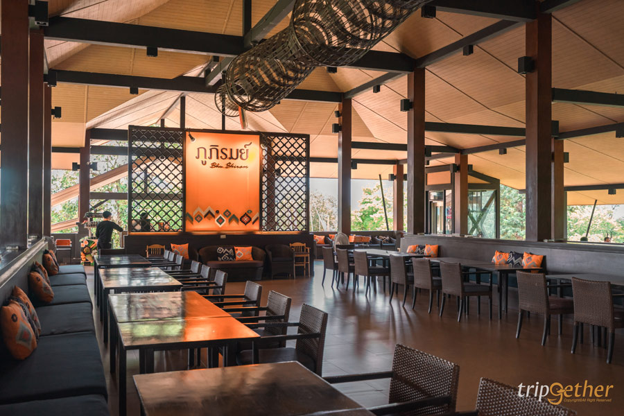 เที่ยวตามจุดต่างๆ กันไปแล้ว เราพักมากินมื้อกลางวันกันที่ ภูภิรมย์ ร้านอาหารกลางไร่ชาที่ตั้งอยู่ภายในสิงห์ปาร์ค เชียงราย ตัวร้านเป็นแบบโอเพ่นแอร์ ตั้งอยู่บนเนินที่สามารถมองเห็นวิวความกรีนได้แบบรอบด้าน แถมยังมีโซนให้เลือกอย่างโซนโถงด้านใน โซนริมระเบียง และโซนที่เราเลือกอย่างโซนเอาท์ดอร์ที่มองเห็นภูเขาได้แบบเต็มๆ
