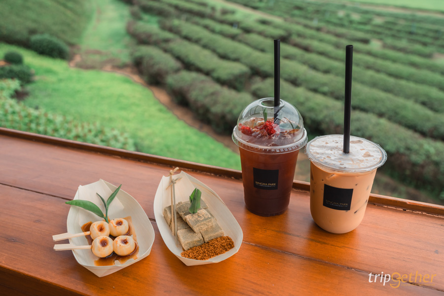 จัดอาหารไปแล้ว ก็ต้องมาต่อของหวาน เดินมาจากร้านภูภิรมย์ไม่ไกลเป็นส่วนของร้าน ชาไทย ร้านขนมที่ตกแต่งสไตล์ญี่ปุ่นได้แบบลงตัวและกลมกลืนไปกับบรรยากาศธรรมชาติ ซึ่งตัวร้านจะตั้งอยู่บนเนินเล็กๆ ที่หันออกสู่ไร่ชาแถมยังเห็นวิวทะเลสาบและภูเขาได้แบบพาโนราม่ากันเลย มาพร้อมกับโซนที่นั่งที่มีทั้งโซนอินดอร์ห้องแอร์ฉ่ำๆ และโซนเอาท์ดอร์ที่เป็นบาร์นั่งห้อยขามองวิวสบายๆ
