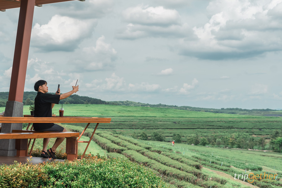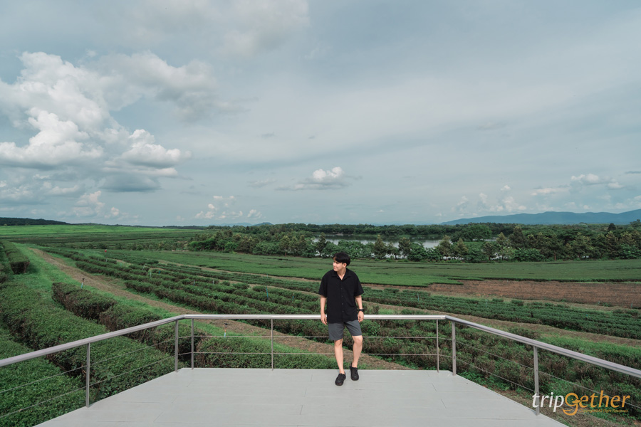 นอกจากนี้ด้านข้างของร้านชาไทย ยังมีมุมถ่ายรูปเก๋ๆ อย่างทางเดินสีขาวที่ทอดยาวออกไปในไร่ชาพร้อมกับวิวทะเลสาบด้วยนะ