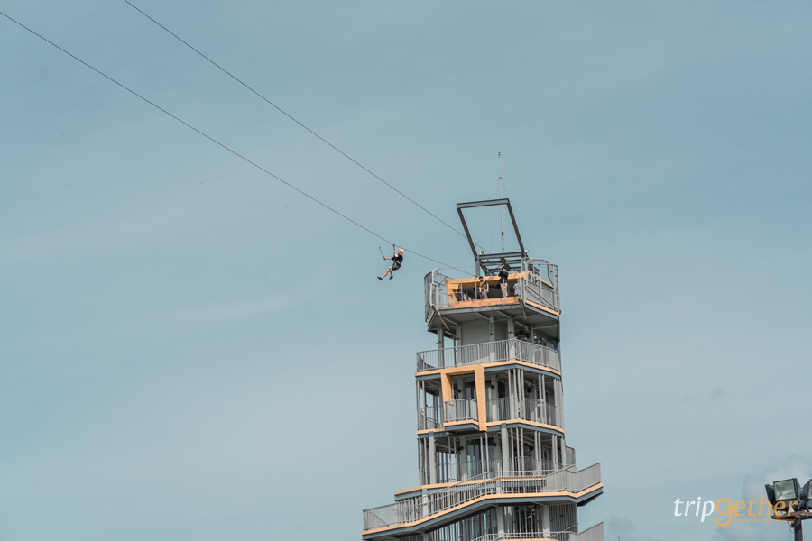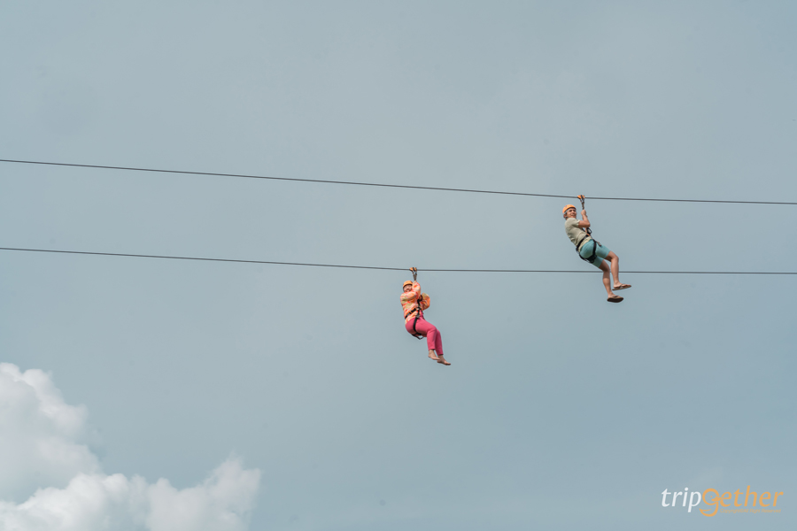 ตะลุยเส้นทางพื้นราบกันไปแล้ว เพื่อความครบรสเราก็มาต่อกันกับ Zip Line ที่มีความสูงเท่ากับตึก 8 ชั้น และมีระยะทางกว่า 400 เมตร แถมภาพด้านล่างก็โล่งเตียนแบบไม่มีอะไรมากั้น ซึ่งก่อนขึ้นไปที่ชั้นปล่อยตัว จะมีพนักงานสวมอุปกรณ์เซฟตี้ให้เสร็จสรรพ และราคาจะอยู่ที่ 300 บาท/รอบ แอบกระซิบว่า Zip Line ของที่นี่เป็นแบบคู่ ใครอยากเล่นพร้อมกับเพื่อน อยากกรี้ดไปพร้อมๆ กันก็จัดได้เลย