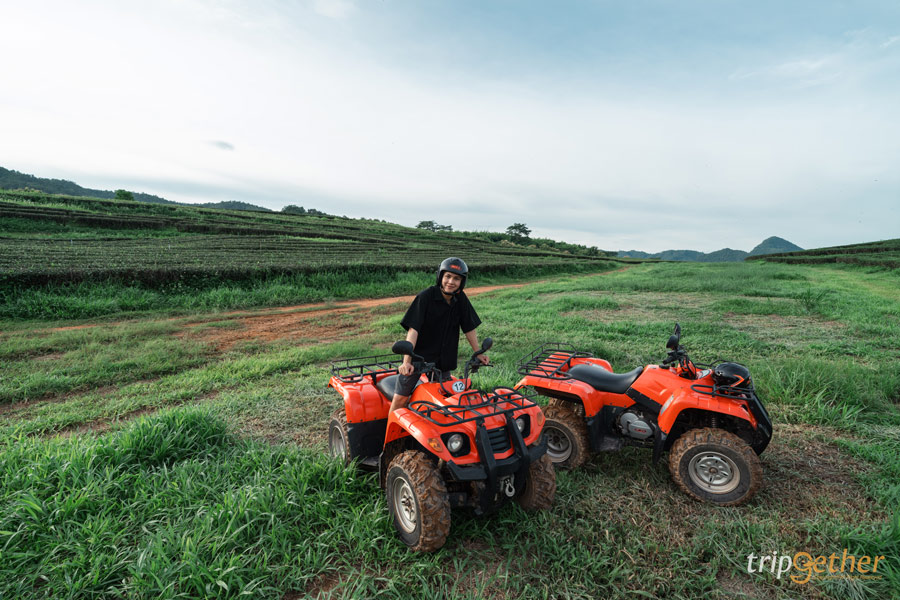 เติมพลังกันเรียบร้อย ก็ได้เวลาทำกิจกรรมกันต่อ เพราะนอกจากร้านอาหาร จุดถ่ายรูป แล้วที่สิงห์ปาร์ค เชียงราย ยังมีกิจกรรมให้ทำกันแบบจัดเต็ม โดยเฉพาะกิจกรรมแบบแอดเวนเจอร์ ซึ่งอย่างแรกที่เราเลือกทำก็คือขับรถ ATV ในไร่ชา ราคาจะแตกต่างกันออกไปขึ้นอยู่กับรูปแบบเส้นทาง ซึ่งครั้งนี้เราเลือกขับแบบจัดเต็มแบบ Adventure Rideกันไปเลย ราคาจะอยู่ที่ 800 บาท และก่อนที่เราจะขับ ATV ทางพนักงานที่มีความชำนาญจะมาแนะนำวิธีการขับเบื้องต้นให้กับเราก่อน ปลอดภัยหายห่วง