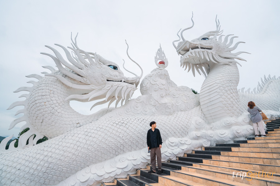 ชมวิวกันเสร็จแล้ว เราก็ลงมาด้านล่างกันต่อ ซึ่งถ้าใครอยากนั่งรถรางลงมาที่จุดเดิมก็สามารถขึ้นได้ที่ด้านข้างขององค์พระโพธิสัตว์ได้เลย แต่เราขออยู่ถ่ายรูปสวยๆ กันอีกสักหน่อยก่อนกลับ เลยเลือกที่จะเดินลงมาที่บันได โดยจุดนี้จะมีรูปปั้นมังกรสวรรค์สุดอลังการอยู่ทั้ง 2 ฝั่งของบันได บอกเลยว่ามุมนี้ถ่ายรูปสวยสุดๆ