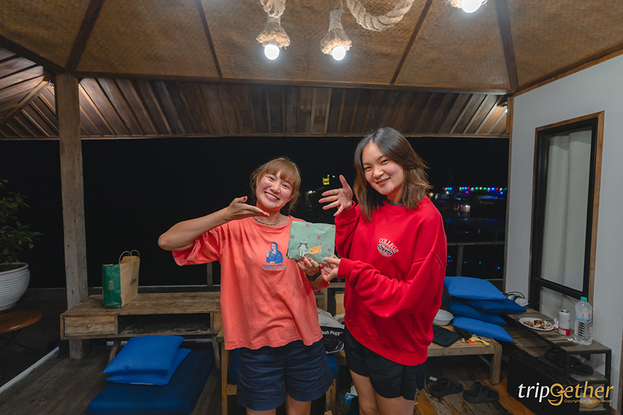 มากันประมาณ 20 คน จองบ้านพัก 2 หลัง ใกล้ๆ กันคือ Sunday Houseboat ประกอบไปด้วย 2 ห้องนอน 2 ห้องน้ำ โถงนั่งเล่น และมีไฮไลท์อยู่ที่อ่างอาบน้ำระเบียงห้อง อีกหลังคือ Pana Houseboat บ้านหลังใหญ่ที่มีถึง 4 ห้องนอน 4 ห้องน้ำ โถงนั่งเล่น และมีห้องน้ำแบบโอเพ่นแอร์ที่มีอ่างให้แช่น้ำไปมองดาวไป บอกก่อนเลยว่าทุกห้องนอนเป็นห้องแอร์และมาพร้อมสิ่งอำนวยความสะดวกครบสะดวกสบายแน่นอน