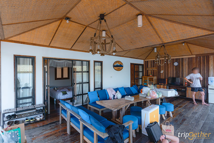 โถงกว้างๆ พร้อมโต๊ะกินข้าวและยังมีเตาปิ้งย่างให้ด้วย สำหรับแพ็กเกจที่เราจองมาประกอบไปด้วย 1.เรือรับ – ส่ง 2.อาหารเช้า 3.เครื่องเล่นไม่ว่าจะ เรือคายัค แทรมโพลีน แพดเดิลบอร์ด มวยน้ำ และเก้าอี้ลอยน้ำ 4.อาหารว่าง 5.อาหารค่ำ ครบจบเลยจ้า