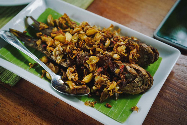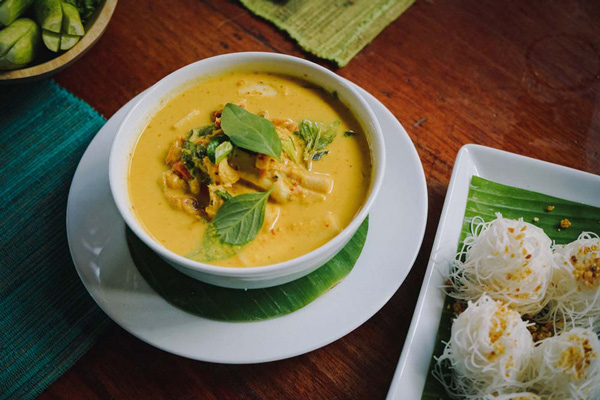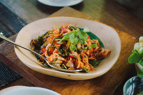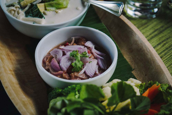 จานนี้ ชื่อ “หนุมาน ประสานกาย” เป็นการผสมผสานการทานคู่กัน น้ำพริกเก็ตกับต้มกะทิกุ้งผักรวม คนใต้เรียกน้ำพริกแบบนี้ว่าน้ำชุบหยำ อร่อยอย่างแรงเลยนิ