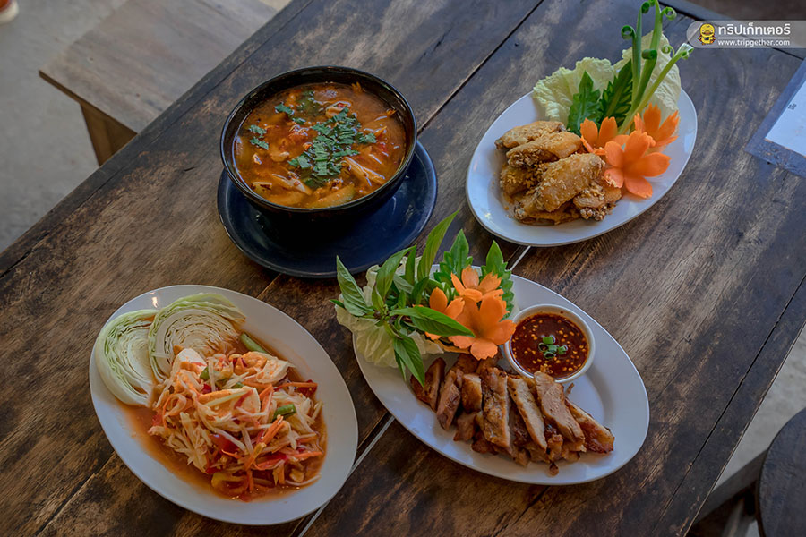 เมนูที่เราสั่งมาวันนี้เป็น หมูย่าง 79 บาท ปีกไก่ทอด 79 บาท ต้มยำหมู 79 บาท ตำไทยไข่เค็ม 60 บาท ส่วนเครื่องดื่มเป็น น้ำเก็กฮวย 30 บาท นั่งกินข้าวดูวิวเพลินๆ กับผู้คนที่สัญจรผ่านไปผ่านมาบนถนนที่ล้วนแต่มีรอยยิ้มให้เห็น เป็นอะไรที่ดีต่อใจสุดๆ