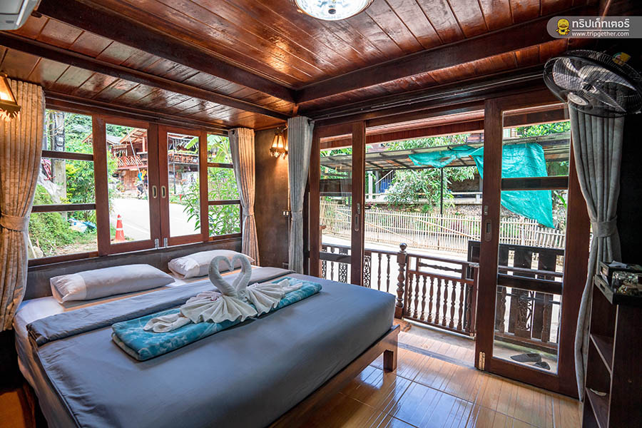 ที่นี่มีห้องพักเพียง 3 ห้องเท่านั้น คือ ห้องดอกเหมี้ยง ห้องดอกแม่กำปอง และห้องดอกกาแฟ ส่วนห้องของเราในคืนนี้ชื่อว่า ห้องดอกกำปอง ตั้งอยู่ชั้นล่าง แต่ไม่ต้องกลัวเสียงรบกวนจากภายนอก เพราะหลัง 5 โมงเย็น นักท่องเที่ยวที่ไม่ได้พักที่นี่ก็จะเดินทางกลับ หมู่บ้านก็เงียบสงบ นอนหลับได้สบายอย่างแน่นอน