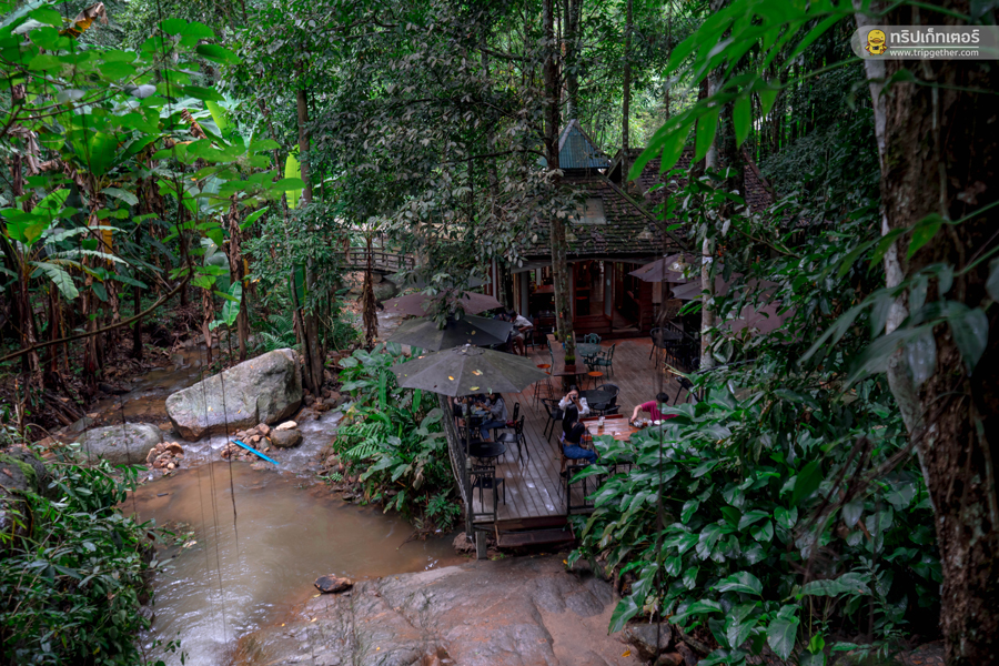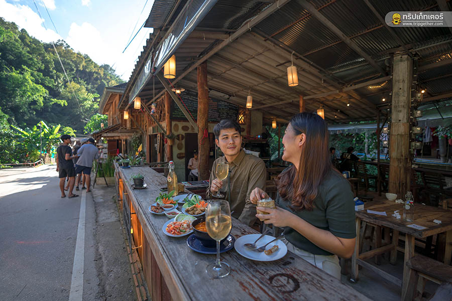 รถขับลัดเลาะพาเราออกจากตัวเมืองไปยังป่าเขาที่เงียบสงบและพาเรามาถึงหมู่บ้านแม่กำปองในช่วงสายๆ ซึ่งจากตัวเมืองใช้เวลาเดินทางประมาณ 1.30 ชั่วโมง มาถึงแล้วก็ไม่รอช้า พาตัวเองมานั่งพักริมน้ำตกและสั่งของอร่อยๆ กินกันที่ ร้านแม่กำปองป้ายแดง ร้านอาหารบรรยากาศดี มีลำธารน้ำไหลให้นั่งฟังเพลินๆ