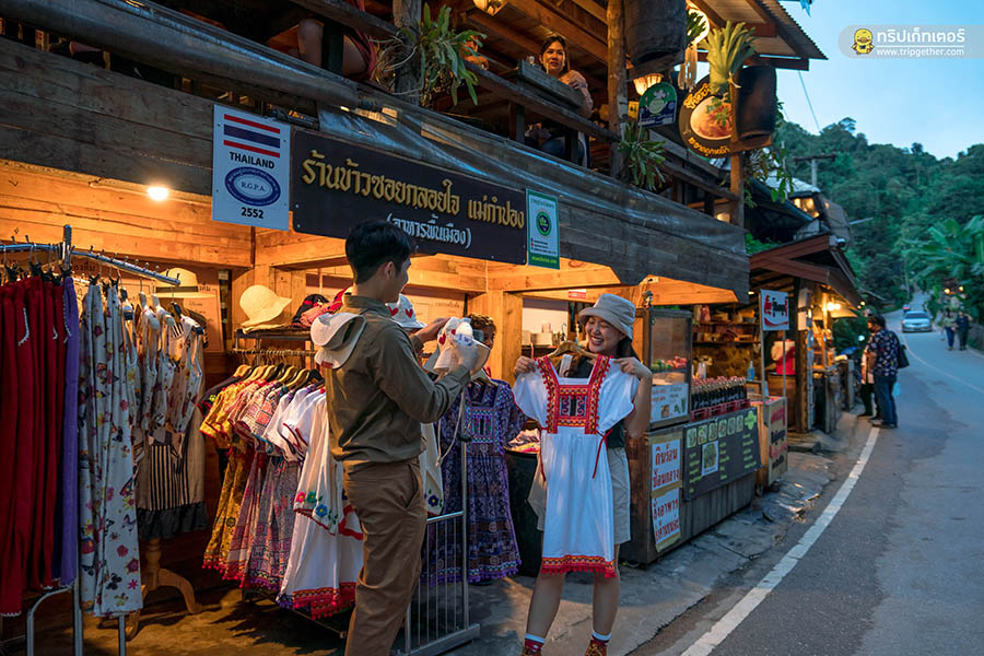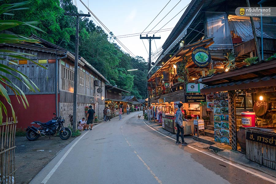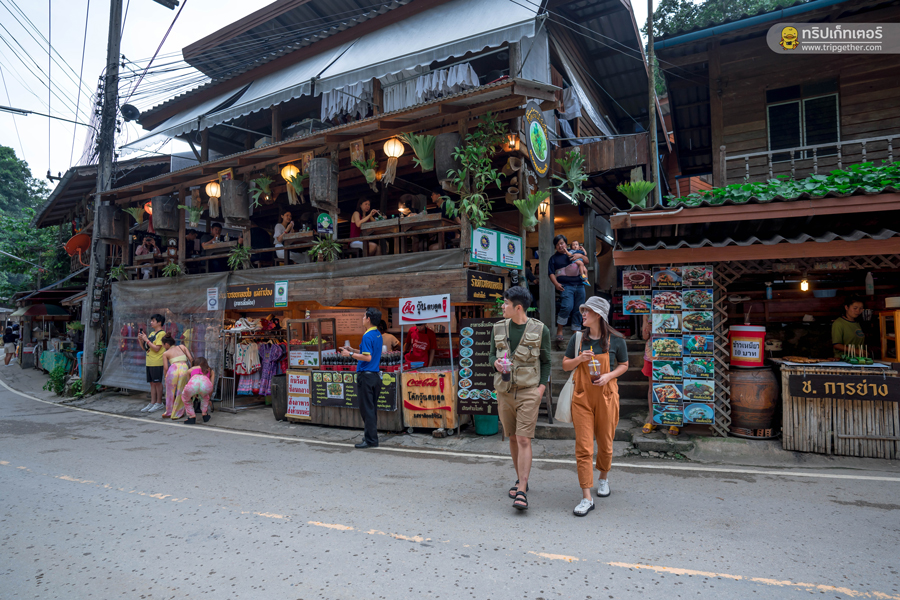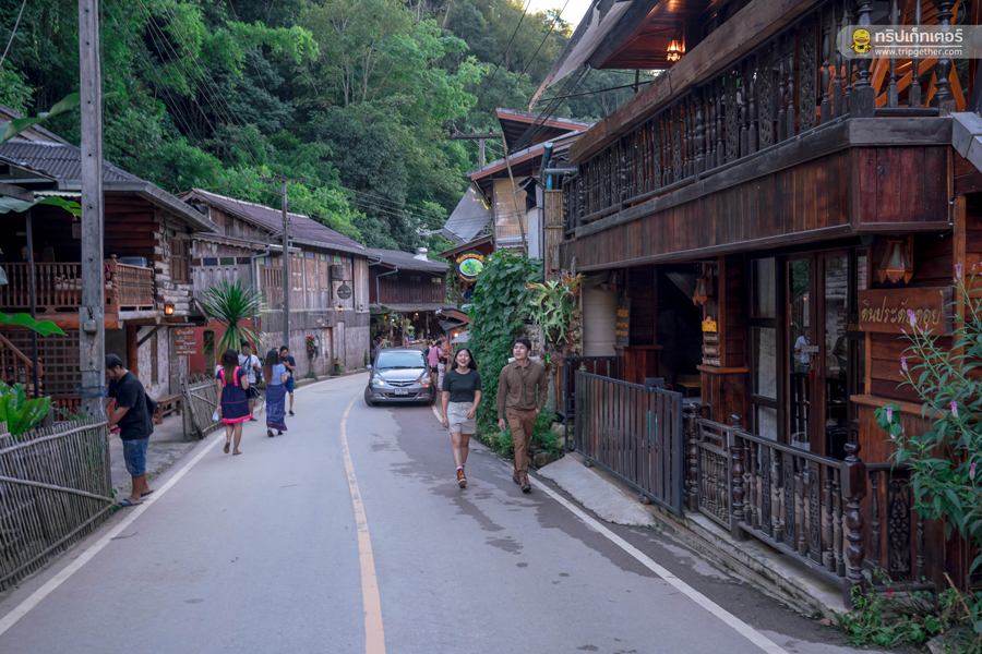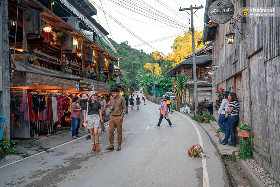 ช่วงเย็นออกไปเดินเล่น สำรวจหมู่บ้านตามมุมต่างๆ หาซื้อของฝากติดไม้ติดมือ รวมถึงซื้อขนมและของกินตามร้านค้าต่างๆ ที่พบเจอ เรียกว่าทั้งเดิน ทั้งกินกันตลอดทั้งเส้นทางกันจนลืมเวลาไปเลย ก่อนจะหมดแรงต้องขอตัวกลับที่พัก เอนกายลงเตียงและหลับตาลงท่ามกลางเสียงน้ำตกและธรรมชาติ