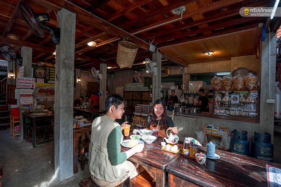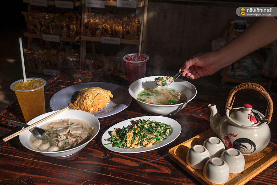 หลังจากตักบาตรเสร็จ ก็ถึงเวลาอาหารเช้าที่เราสามารถเดินไปรับประทานได้ที่ ร้านข้าวซอยกลอยใจ ซึ่งเป็นร้านอาหารของที่พัก ใครที่พักบ้านน้อยกลอยใจสามารถเลือกอาหารได้ 4 เมนูต่อ 1 ห้องพัก เช้านี้เราสั่งเป็น ข้าวต้มหมู ข้าวไข่เจียวหมูสับ และก๋วยเตี๋ยวหมูน้ำใส โดยมีชายอดน้ำค้างร้อนๆ เสิร์ฟมาให้จิบเบาๆ ระหว่างมื้อด้วย