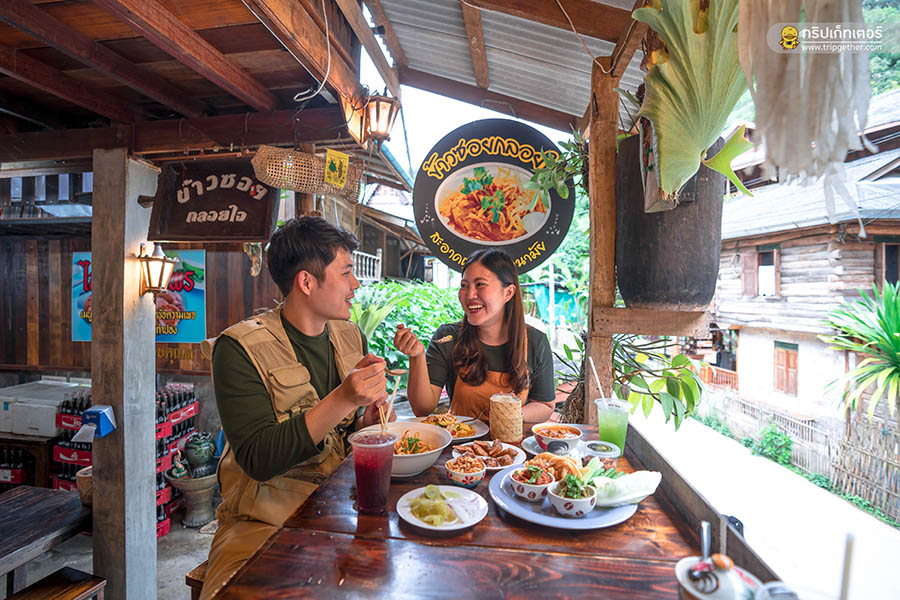 ช่วงบ่ายๆ เราจะมาฝากท้องกันที่ ร้านข้าวซอยกลอยใจ ร้านอาหารเหนือใจกลางหมู่บ้านสุดน่ารัก ลักษณะเป็นบ้านปูนขัดมันกึ่งไม้ 3 ชั้น ติดถนนแลนด์มาร์คของหมู่บ้านแม่กำปอง เอกลักษณ์ของร้านคือการตกแต่งด้วยถังหมักเมี่ยง ซึ่งถือเป็นอีกหนึ่งวิถีชีวิตของชาวบ้านแห่งนี้