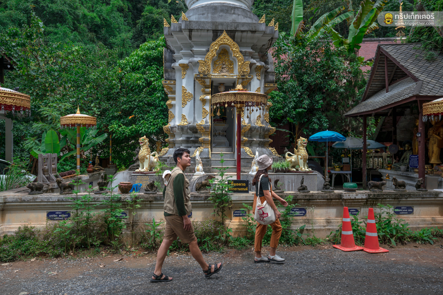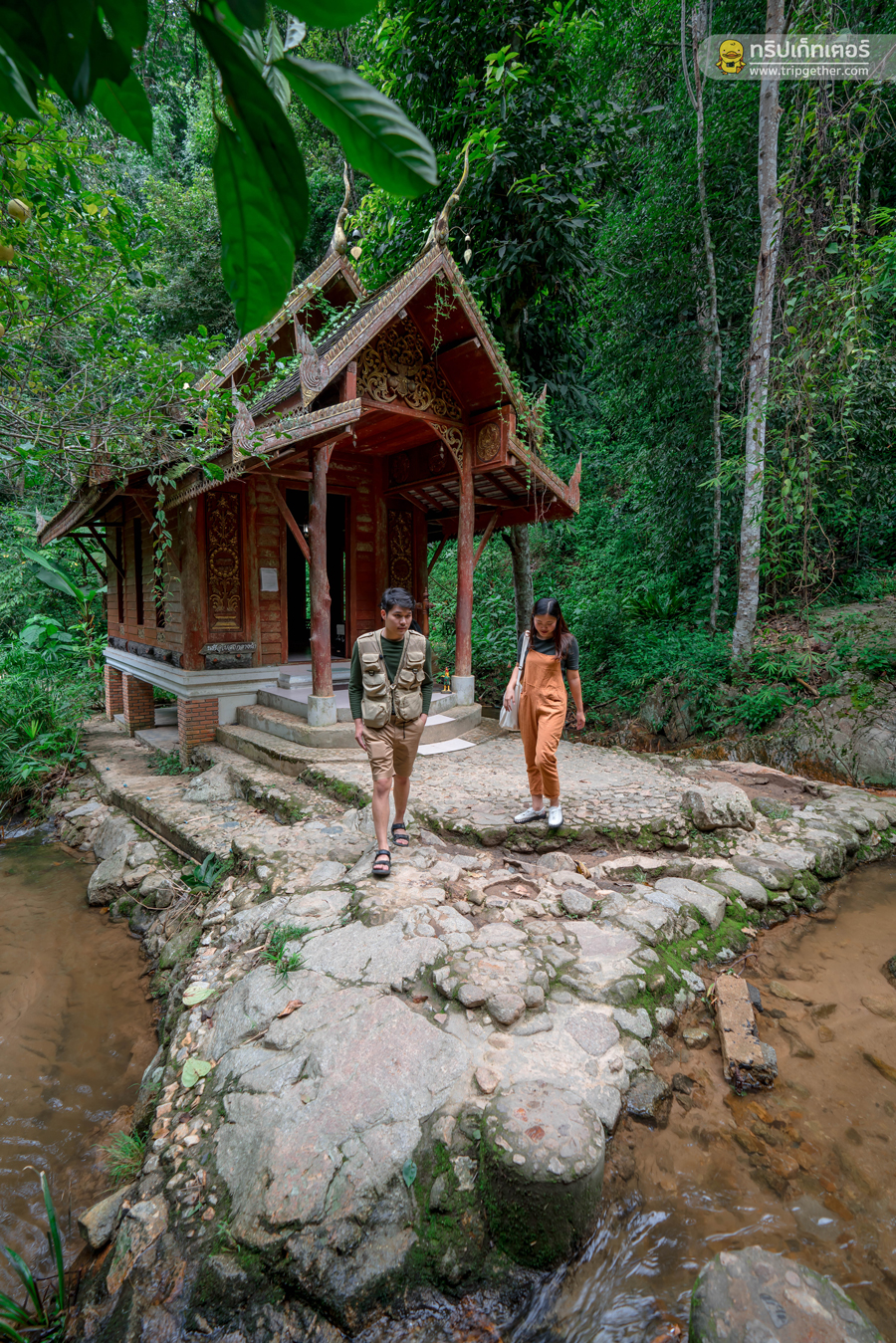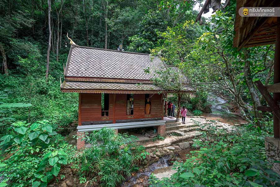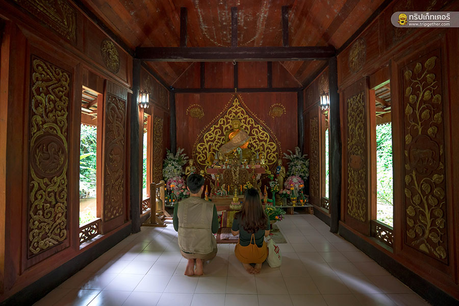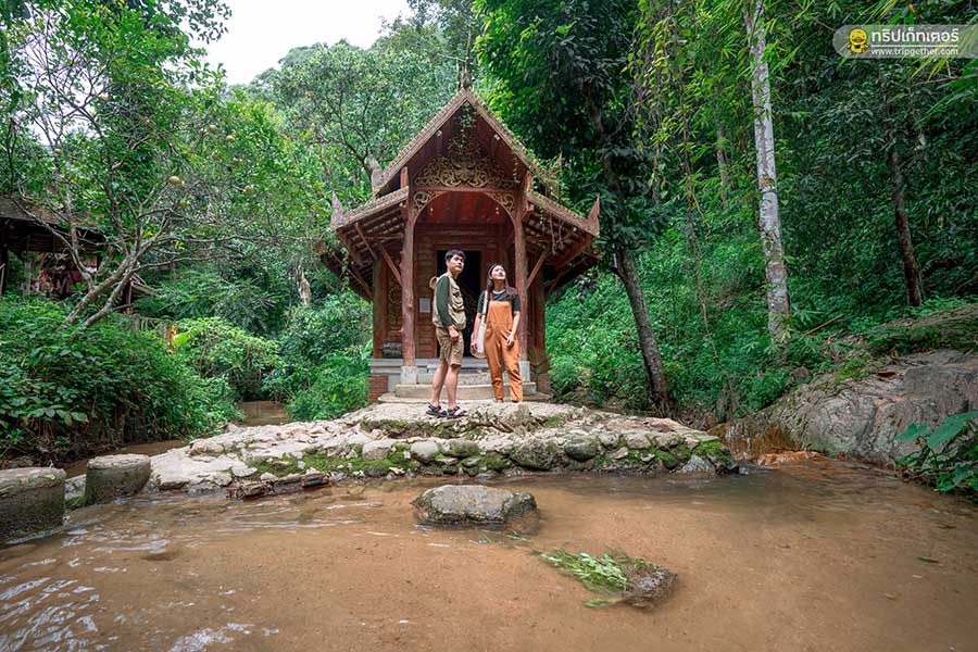 เดินตามทางลงมาเรื่อยๆ จะเจอโบสถ์กลางน้ำ ซึ่งเป็นไฮไลท์สำคัญของวัดแห่งนี้ เราทั้งคู่ได้เข้าไปไหว้สักการะพระพุทธรูป ขอพรเพื่อเป็นสิริมงคลแก่การมาเที่ยวในทริปนี้ ภายในวิหารสร้างด้วยไม้สักทองแบบล้านนา ตกแต่งลวดลายอย่างประณีต รอบบริเวณมีธารน้ำที่ไหลมาจากน้ำตก สามารถถ่ายรูปออกมาได้อย่างสวยงาม