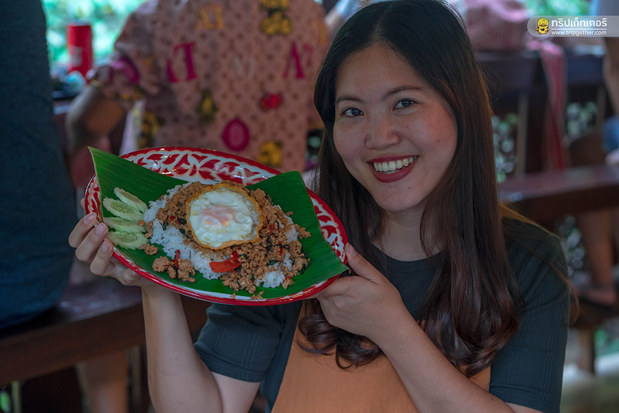 เมนูที่สั่งมาจะเป็น กะเพราถาดหมูไข่ดาว 80 บาท ก๋วยเตี๋ยวต้มยำไข่หวาน 50 บาท และส้มตำผลไม้ 60 บาท