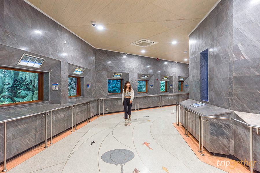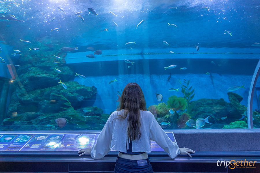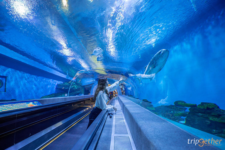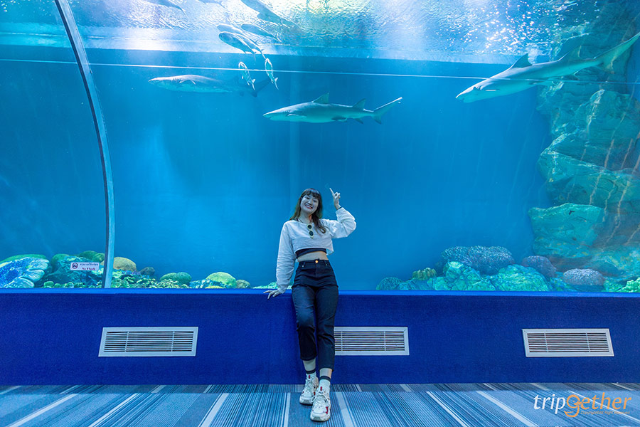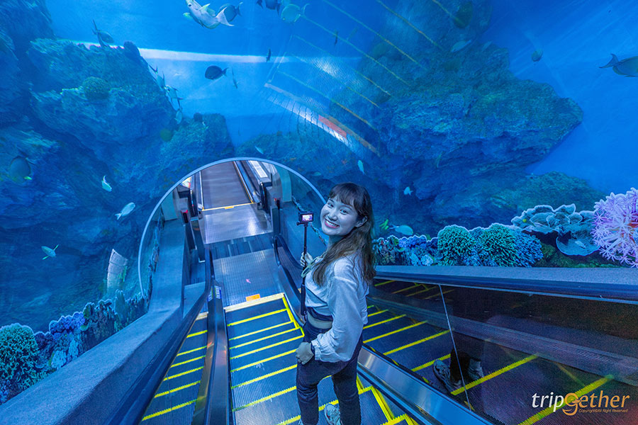 เดินกันต่อจะเป็นอุโมงค์ปลาที่ยาวกว่า 75 เมตร ตลอดทางรู้สึกเหมือนหลุดไปใต้ทะเลจริงๆ มีแนวปะการังที่สวยงามและฝูงปลาสีสันต่างๆ ทำให้เราเดินไปพลางก็ต้องหยุดดูไปพลาง มันมีสิ่งที่น่าสนใจเต็มไปหมด บวกกับอากาศเย็นๆ และมีเสียงคลื่นน้ำเบาๆ ช่วยเสริมบรรยากาศเข้าไปอีก บอกเลยว่าเป็นมุมที่เลิฟมาก