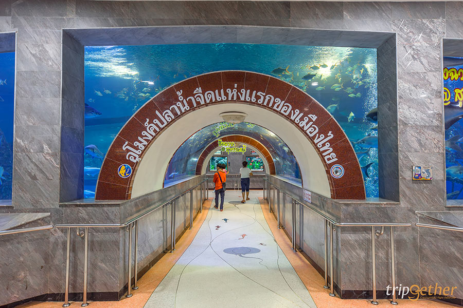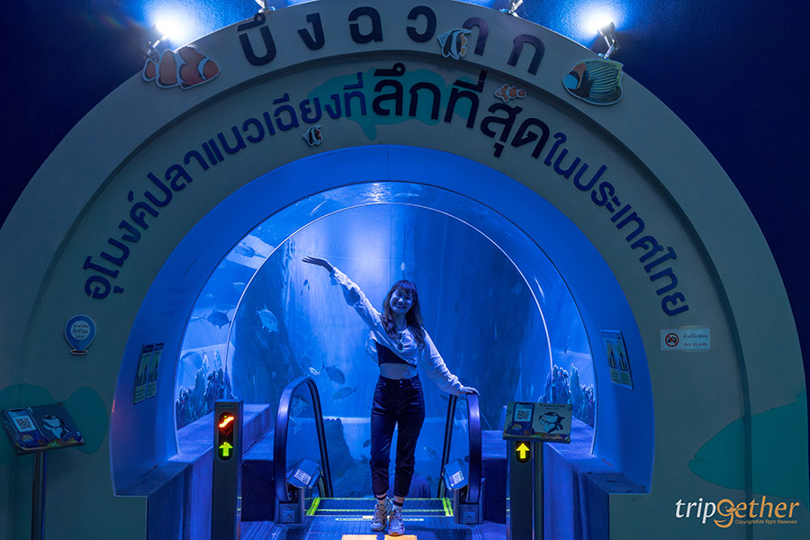 ถัดเข้ามาจากโซนปลาน้ำจืดจะเป็นโซนปลาทะเลและฉลาม ตรงนี้จะเสียค่าเข้าเพิ่มอีกคนละ 150 บาท ด้านในได้จำลองโลกใต้ท้องทะเลไว้อย่างสวยงาม รวมถึงมีไฮไลท์เด็ดๆ ตามจุดต่างๆ เริ่มที่แรกเปิดโลกใต้ทะเลด้วยอุโมงค์แนวเฉียงที่ลึกที่สุดในประเทศไทย จุดนี้จะเป็นบันไดเลื่อนที่ค่อยๆ เลื่อนลงช้าๆ ให้เราได้ดื่มด่ำกับท้องทะเลและเหล่าปลานานาชนิด อีกทั้งยังเป็นมุมถ่ายรูปยอดฮิตสุดๆ