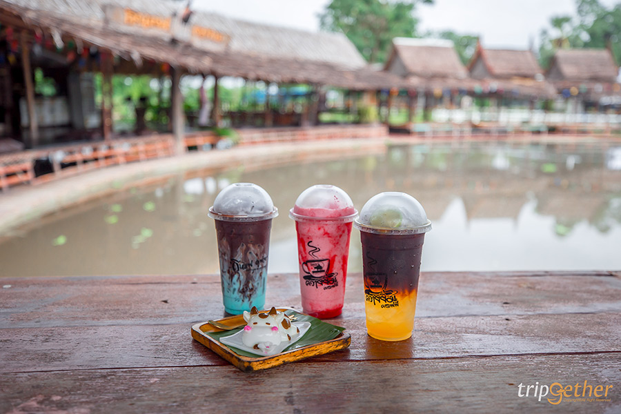 มาถึงไฮไลท์ของหมู่บ้านอนุรักษ์ควายไทยก็คือ การมานั่งชิลล์และให้อาหารควายที่ กินแฟ ดูฟาย เป็นคาเฟ่ที่มีเอกลักษณ์ไม่เหมือนที่ไหน ตัวร้านเป็นครึ่งวงกลมล้อมรอบบ่อน้ำขนาดใหญ่ ใครที่มาห้ามพลาดการให้อาหารควายอย่างใกล้ชิด เพียงแค่เราถือหญ้าไว้ในมือ น้องๆ ควายก็จะว่ายน้ำตรงมาหาเราทันที เอาจริงๆ น้องน่ารักมากและดูเชื่องสุดๆ