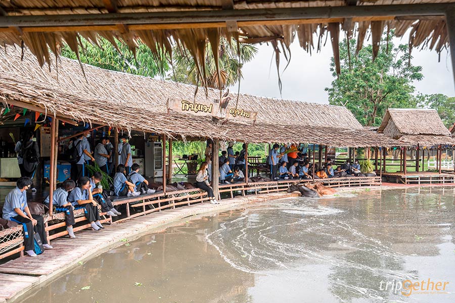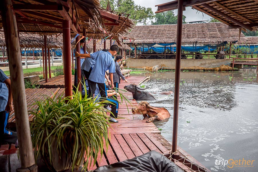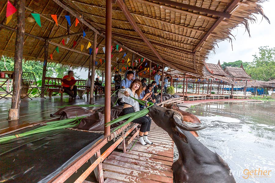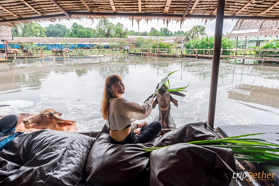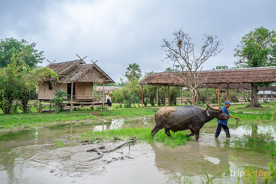 หลังจากลองชุดเรียบร้อยก็เลือกชุดที่ทะมัดทะแมงพร้อมตะลุยเที่ยว ปักหมุดมาที่แรก หมู่บ้านอนุรักษ์ควายไทย เป็นที่เที่ยวเชิงอนุรักษ์ ให้ความรู้เกี่ยวกับความเป็นมาและวิถีชีวิตของชาวนาสมัยก่อน รวมถึงเป็นที่อนุรักษ์ควายไทย ซึ่งเป็นสัตว์ที่อยู่คู่กับเกษตรกรไทยมาอย่างยาวนาน ภายในหมู่บ้านมีการจำลองบ้านของชาวนาเพื่อสะท้อนวิถีชิวิตและการทำนา นอกจากนี้ยังมีกิจกรรมให้ทำมากมาย ไม่ว่าจะเป็นให้อาหารควาย ดูการแสดงความสามารถพิเศษ ดำนา นวดข้าว เรียกได้ว่ามาเที่ยวก็สนุก พร้อมกับได้ความรู้กลับไปเต็มๆ ส่วนราคาค่าเข้าเพียง 30 บาทเท่านั้น