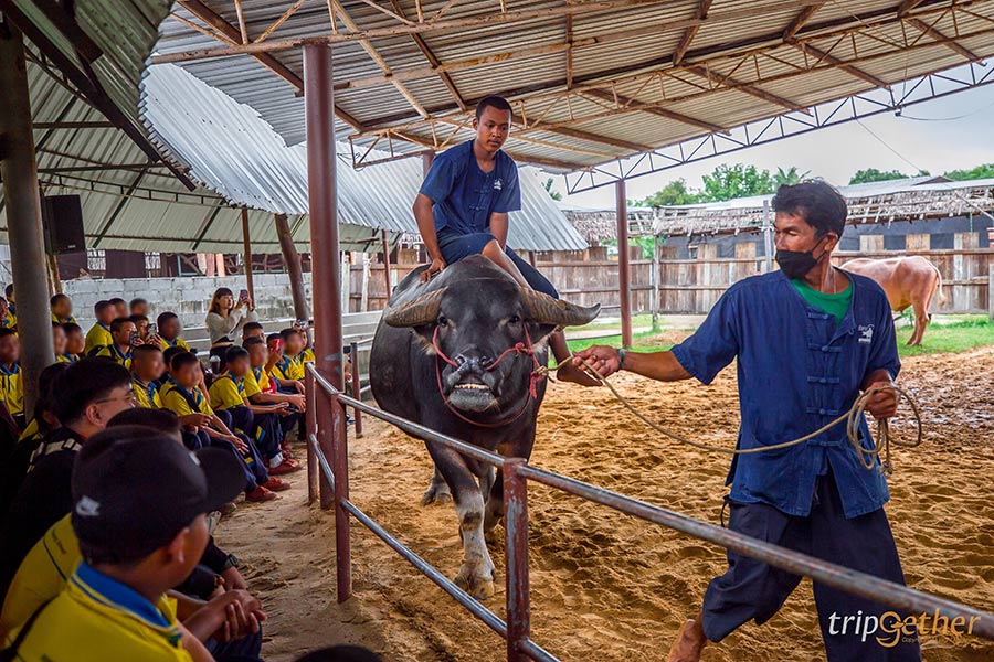 มาต่อที่การแสดงความสามารถของควาย ราคาเข้าชม 20 บาทโดยตรงนี้จะมีการแนะนำให้รู้จักกับน้องควายแต่ละตัว รวมถึงมีการพูดถึงความสำคัญและให้ความรู้เกี่ยวกับควายที่เป็นส่วนหนึ่งของเกษตรกรรมไทยสมัยก่อน ไม่ว่าจะเป็นการทำนา การบรรทุกของ หรือแม้แต่การออกศึก นอกจากนี้ใครที่คิดว่าควายเป็นสัตว์ที่โง่ บอกเลยว่าต้องลองมาดูโชว์ควายที่นี่ น้องสามารถสวัสดี ยกขาตามคำสั่ง การเดินขึ้นที่สูง และที่น่ารักมากคือควายยิ้ม เรียกได้ว่าเป็นการแสดงที่ทำให้เราเปิดโลกและเห็นมุมมองใหม่ๆ เกี่ยวกับควาย