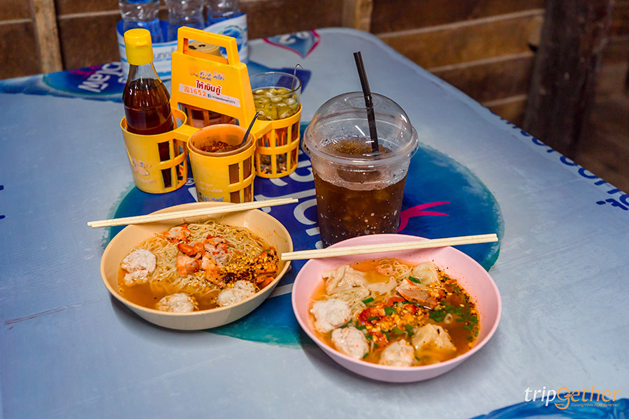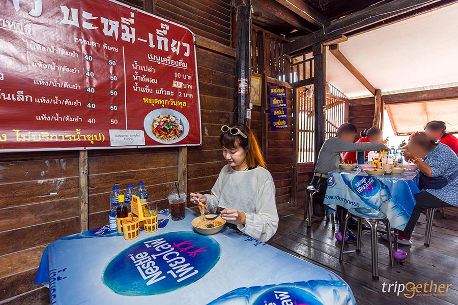 เดินช้อปปิ้งมาสักพัก ก็ได้เวลาของมื้อเที่ยงจริงจัง เราแวะมาร้าน เจ็กอ้าว บะหมี่-เกี๊ยว เป็นร้านบะหมี่ สูตรแต้จิ๋วในตำนานที่ส่งต่อความอร่อยมากกว่า 80 ปี ร้านตั้งอยู่ริมแม่น้ำท่าจีน บรรรยากาศสบายๆ มีลูกค้าแวะเวียนเข้ามาไม่ขาด เห็นแบบนี้ก็เชื่อได้ว่าอร่อยแน่นอน