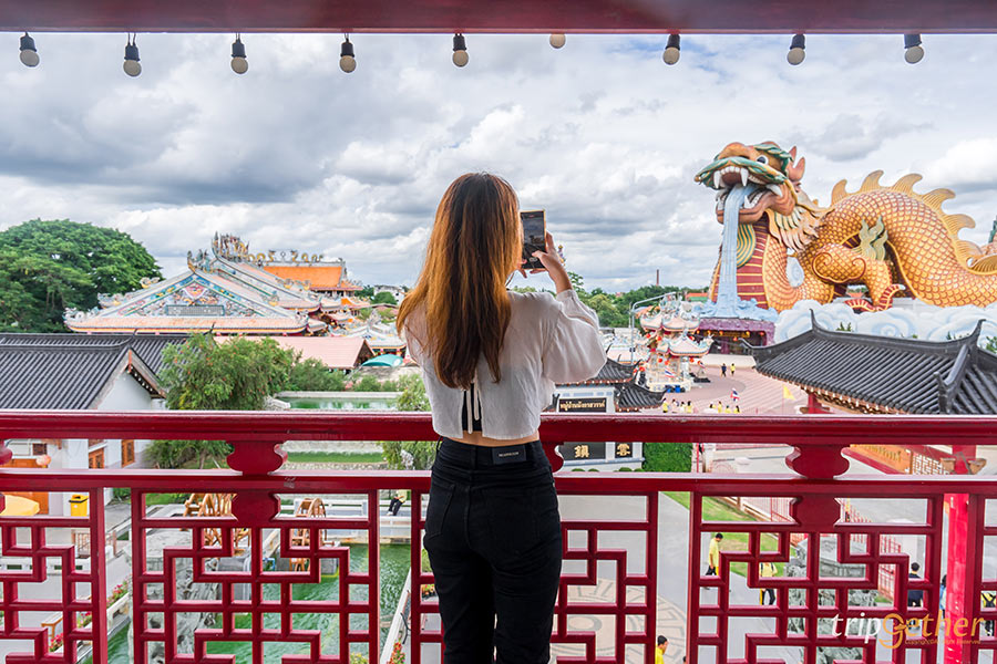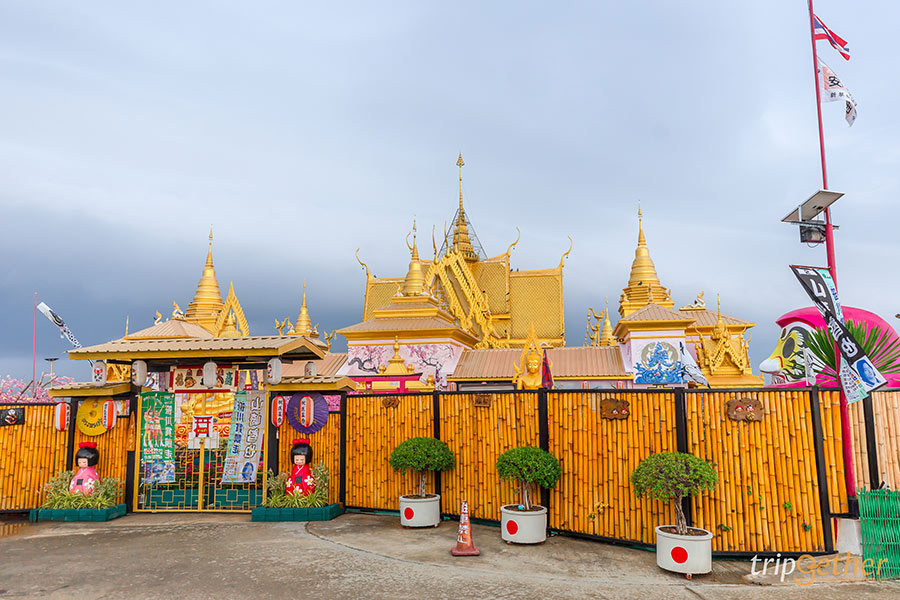 อีกมุมที่มาแล้วต้องเช็คอินก็คือบริเวณด้านนอกวิหาร ตรงนี้มีจุดให้ถ่ายรูปฟีลญี่ปุ่นเยอะมาก ตั้งแต่ซุ้มดอกซากุระที่มีฉากหลังเป็นวิหาร บอกเลยว่าสวยมาก นอกจากนี้ยังมีกำแพงไม้ไผ่ รูปปั้นตุ๊กตาญี่ปุ่น โปสเตอร์หนัง โคมไฟญี่ปุ่น ธงปลาคาร์ป เรียกได้ว่ามีกลิ่นอายความเป็นญี่ปุ่นอยู่ในทุกๆ ส่วน